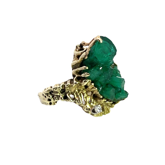 Brutalist, Modern 14KY gold, diamond, and Chatham Emerald rough crystal ring