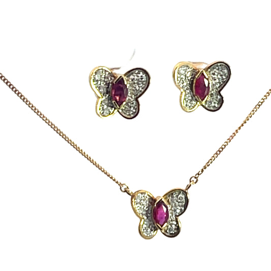 Modern 18KY and white gold Bucherer ruby and diamond butterfly necklace and earring set