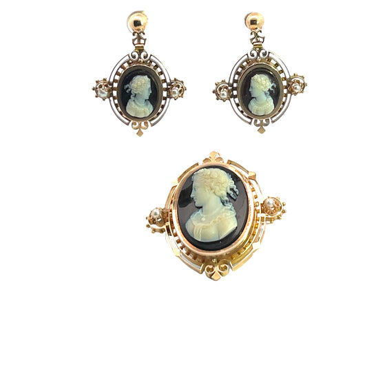 Victorian 18KY gold Hardstone Cameo earring and convertible pendant set