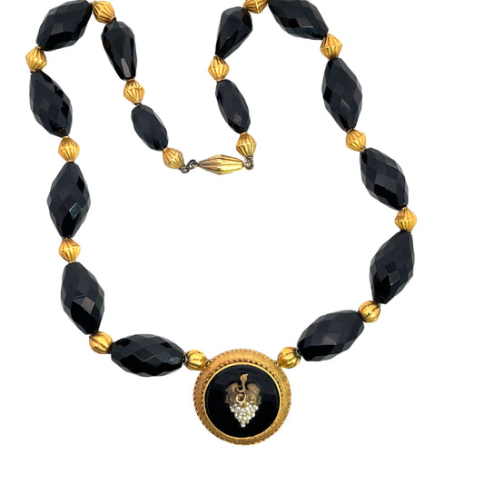 Victorian 18KY Gold, Onyx, and Seed Pearl Necklace and Earring Set