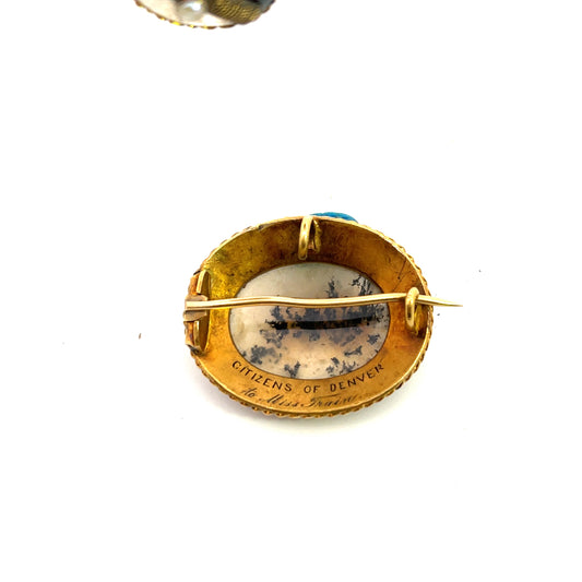 Victorian 18KY gold and moss agate necklace and brooch set in antique box