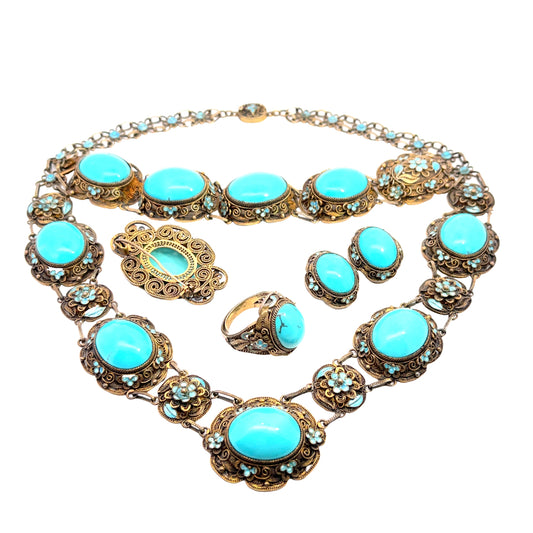 Turn of the Century Silver with Gold wash, Chinese turquoise, and blue enamel, Parure set