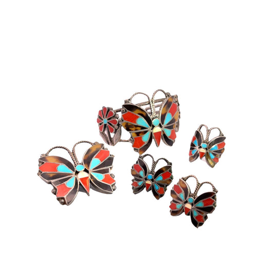 Native American Suite of Butterfly motif inlay coral, turquoise, mother of pearl, onyx and agate in sterling silver signed by A. Rosita Wallace