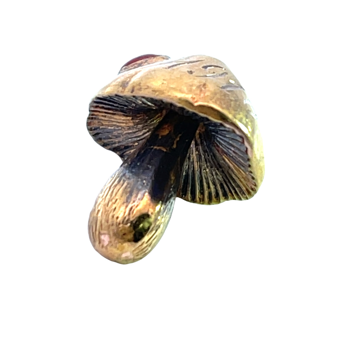Description : Did you know that the symbol of the mushroom represented spiritual re-growth, and enlightenment? What a great way to support a friend in time of need. Mushrooms have been eaten for food and taken for their hallucinogenic properties for thousands of years. Throughout history they have represented spiritualism and have been surrounded by mysterious tales, for instance the mushroom fairy rings in Great Britain. Cast in solid gold, and 20mm tall x 15mm wide, this mushroom is hand engraved with the year 1916. A darling enameled ladybug sits atop the cap. 1916 was the year Einstein formulated his theory on relativity which included gravity. Collecting charms always indicate a memento of a time and a place. This charm certainly does.