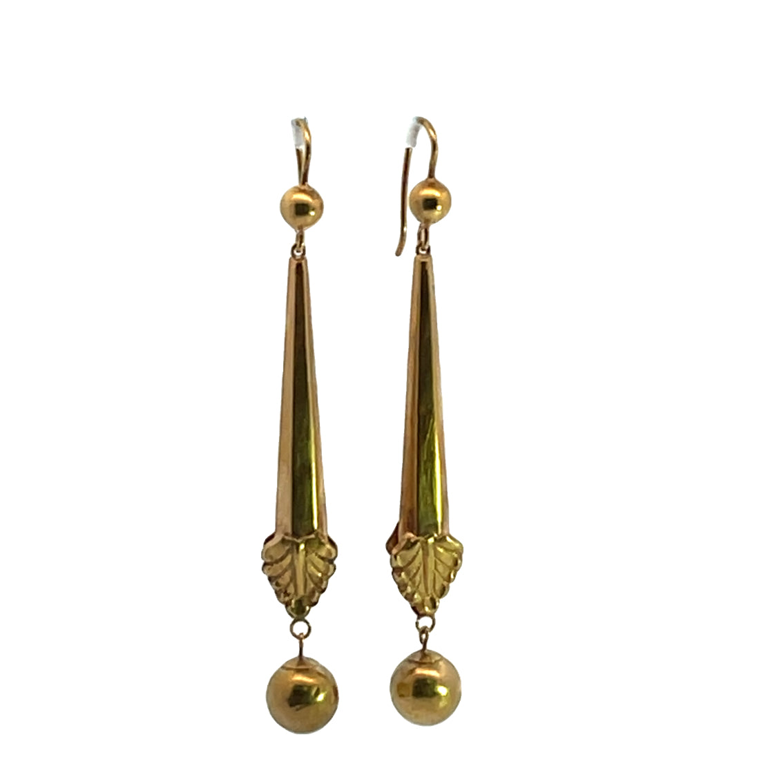 Description : The British jewelers were known to use 9KY gold, and pieces were often marked .375, to indicate gold purity, Long, lean and elegantly designed, these richly toned shepherd hook earrings drape beautifully from the ear. The graduated tubular forms are light but big on presence, and the carved leaf is just the right amount of texture. The hand formed balls at the bottom of each drop add a delightful touch of movement.