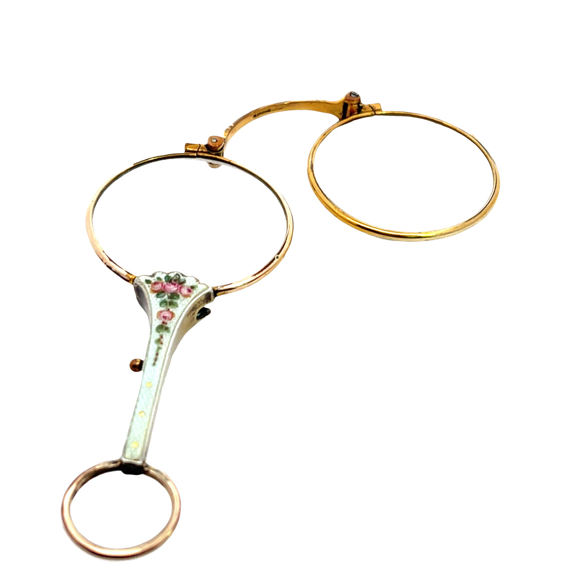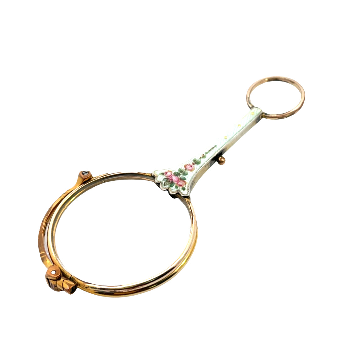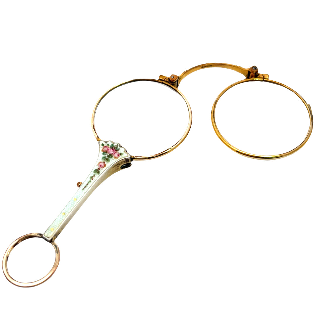 Description : The enamel work on this lovely piece of history is a rose floral pattern and is so feminine. A lorgnette is a pair of magnifying glasses that enlarges reading material. They were also a status symbol used with a bit of haughty demeanor! This pair is in such pristine condition, and appears to be rarely used. A great gift for someone who needs a bit of magnification and a pendant.