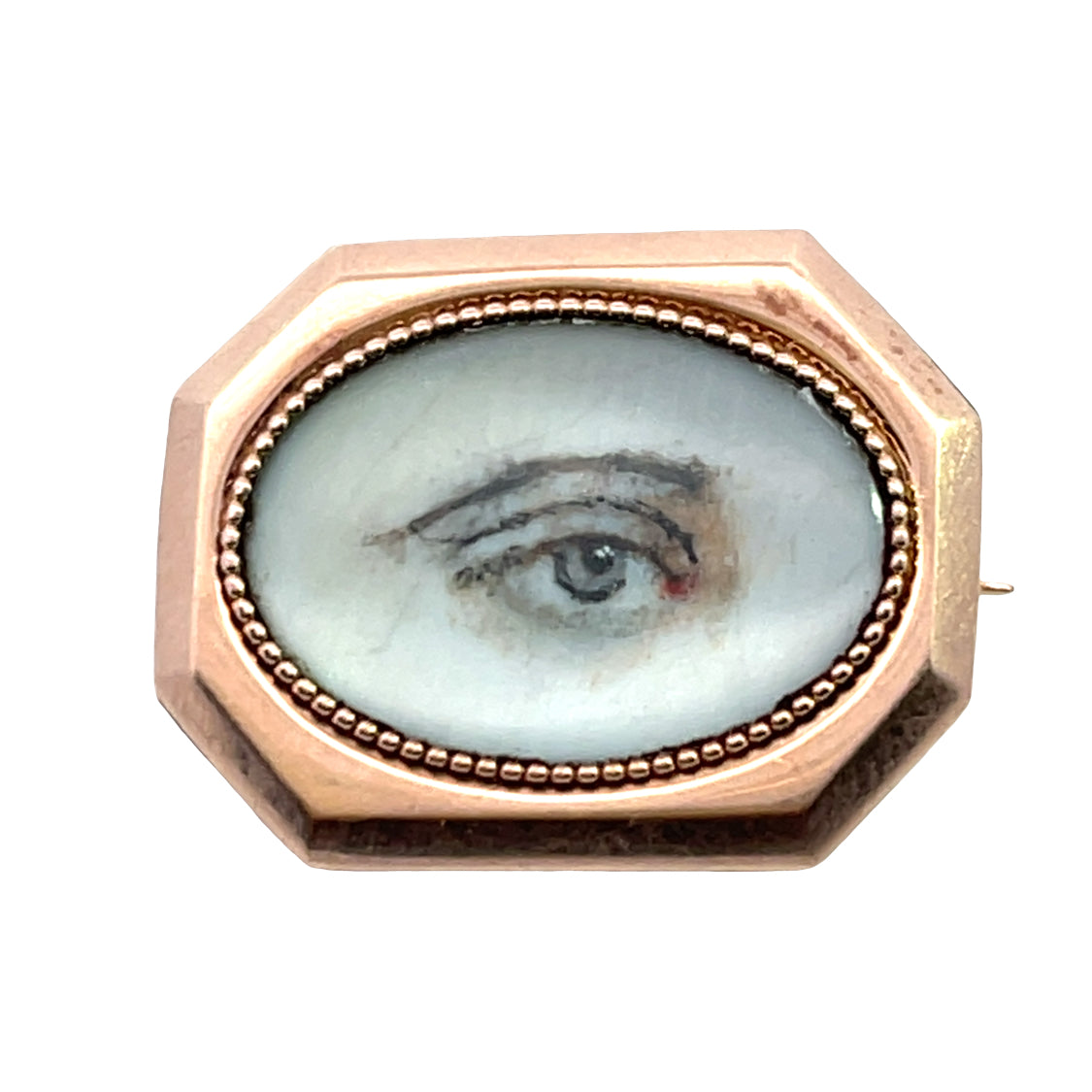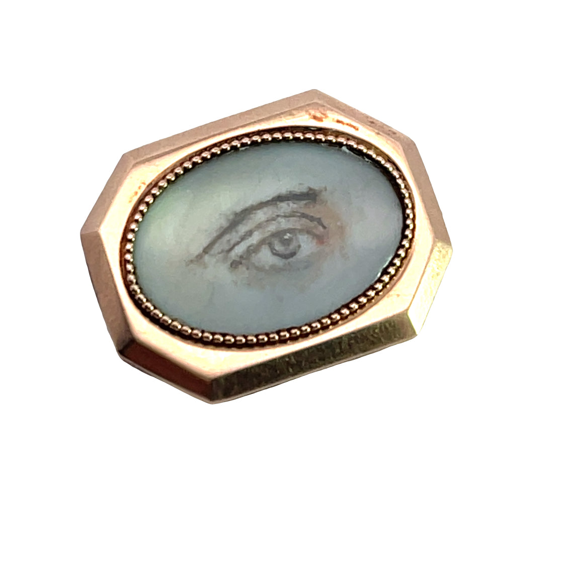 Description : What a love story! In 1785 Maria Anne Fitzhebert opened a love letter from her lover, Prince George of Wales. Their love was fraught with obstacles, between the rules of royalty and religion, she had to flee. He was determined however to ask for her hand in marriage. To her surprise he sent a gift that stated, "I send you a parcel". Inside was an enamel painted image of his eye forever preserved in a loving gaze. They were covertly wed very soon after, and she also had her eye painted for him, so that when he was not near her, he could always see her adoring look. This c. 1790, 15K rose gold pin and enamel hand painting is the representation of someone's eye from nearly 200 years ago. What a poignant memento, and British historic treasure. The lover's eye became a popular trend in the 1800's through the early 20th century.