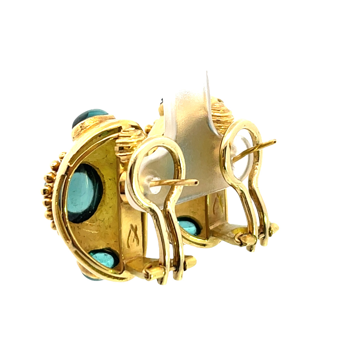 Description : Self named, 'The Accidental Jeweler', Elizabeth Locke has a penchant for the finest estate and is on what she calls a continual treasure hunt. Elizabeth finds the rarest pieces, and repurposes them into something that is wearable today in the modern world. These earrings each have three significant round bluish green tourmaline cabochon cut gems set into a buttery, hand hammered 18KY gold with ancient details like the giant milgrain spheres surrounding the largest stones. An omega back is needed to secure these weighty pieces on your ear, but the look is undeniable luxury and class, attributed to the work of over 30 master Thai goldsmiths crafting her designs. She operates two flagship stores, one in Manhattan and one in Virginia and is represented in boutiques around the country.