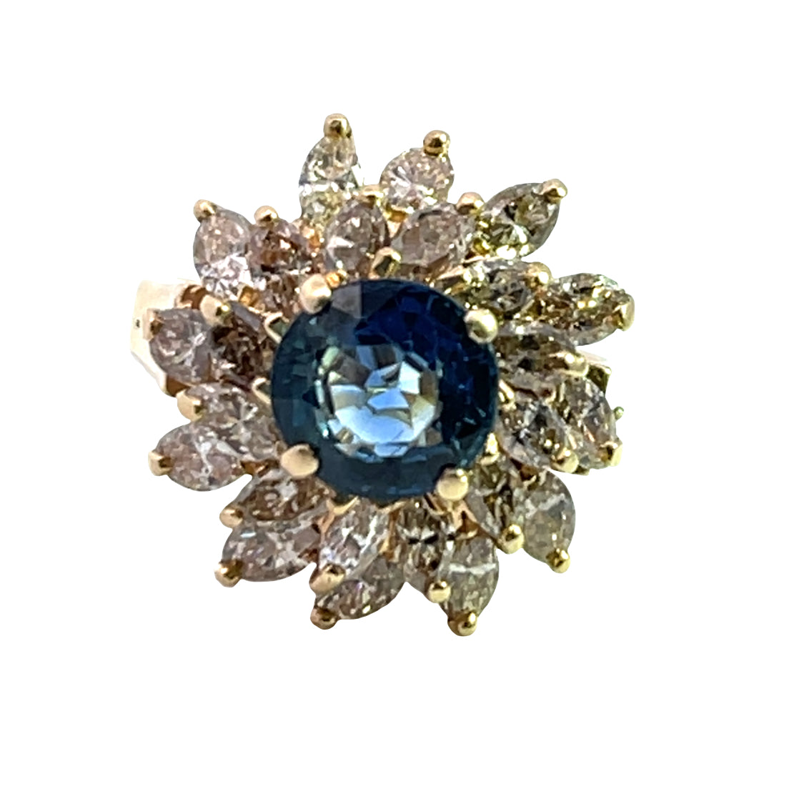 Description : In the 1860's, there was blue sapphire coming from the Yogo Gulch mine. Tiffany's called them the most precious gemstone ever found in the United States. Today there are several Montana sapphire mines operating, but we know that the material is getting much more difficult to mine, and the blue/green teal Montana sapphires are increasingly rare. This amazing 2 carat Montana greenish blue round faceted sapphire is a prize. Stones this big are very scarce, and becoming extremely expensive. This nebula style ring holds this treasure in a 14KY gold ring and 4 prong setting. Swirling around the centerpiece, is a double halo of prong set graduated size, 1.25 ctwt marquise natural white diamonds. This ring is bursting with beauty and rareity. Size 6.75