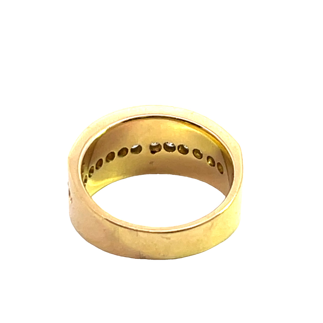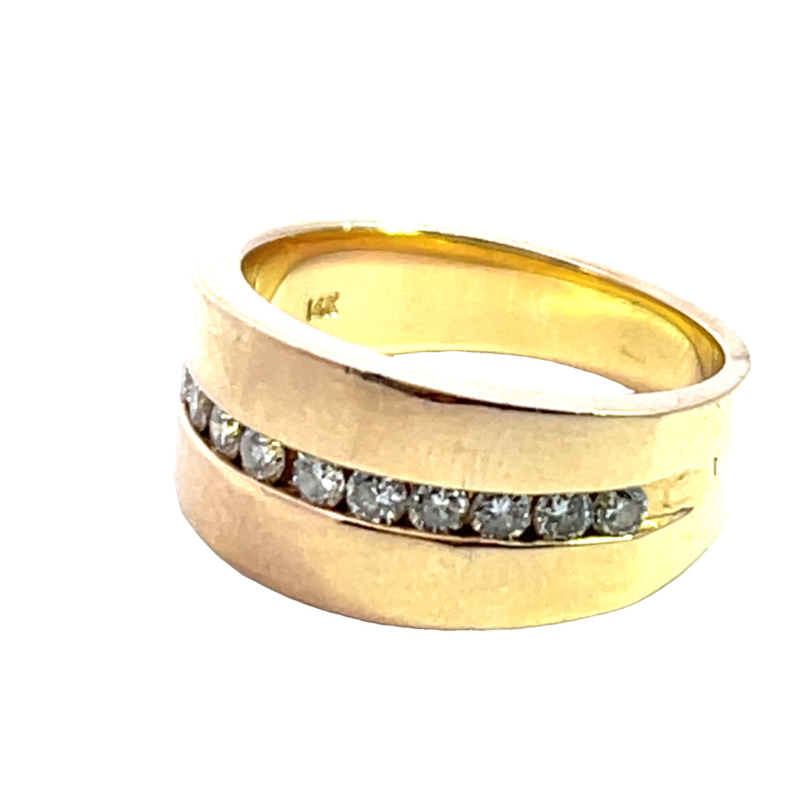 Description : Sometimes simplicity is the greatest statement of all. Elegance can often be understated and still be fully recognized in a design. This 14KY gold ring is a perfect example of this. A nice 9mm wide band has a channel set row of .40 ttl carat weight natural white round diamonds securely set in the middle. A partial channel is sometimes best as diamonds completely around a band are often at risk. This is a lovely way to wear a wide ring comfortably, and that has a lot of classic style. Size 5.75
