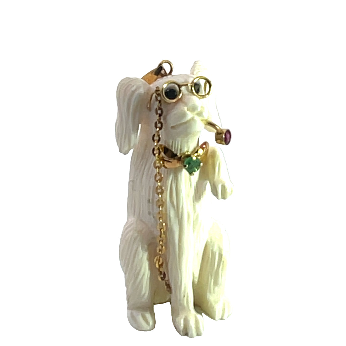 Description : With one foot upraised, somebody's good boy is awaiting a treat. Faceted round blue sapphire eyes are inset behind 14KY gold spectacles, a golden bow with emerald about the neck, and a ruby accented smoking pipe shows a carved bone dog of intelligence and leisure. Well heeled, he looks to be a larger breed. A 14KY gold bail is inset in his head to put on a chain as a pendant, and a 14KY gold chain is his leash and attached to the spectacles like a lanyard. This 40mm x 20mm pendant is a very animated and fun piece, especially for that dog lover!