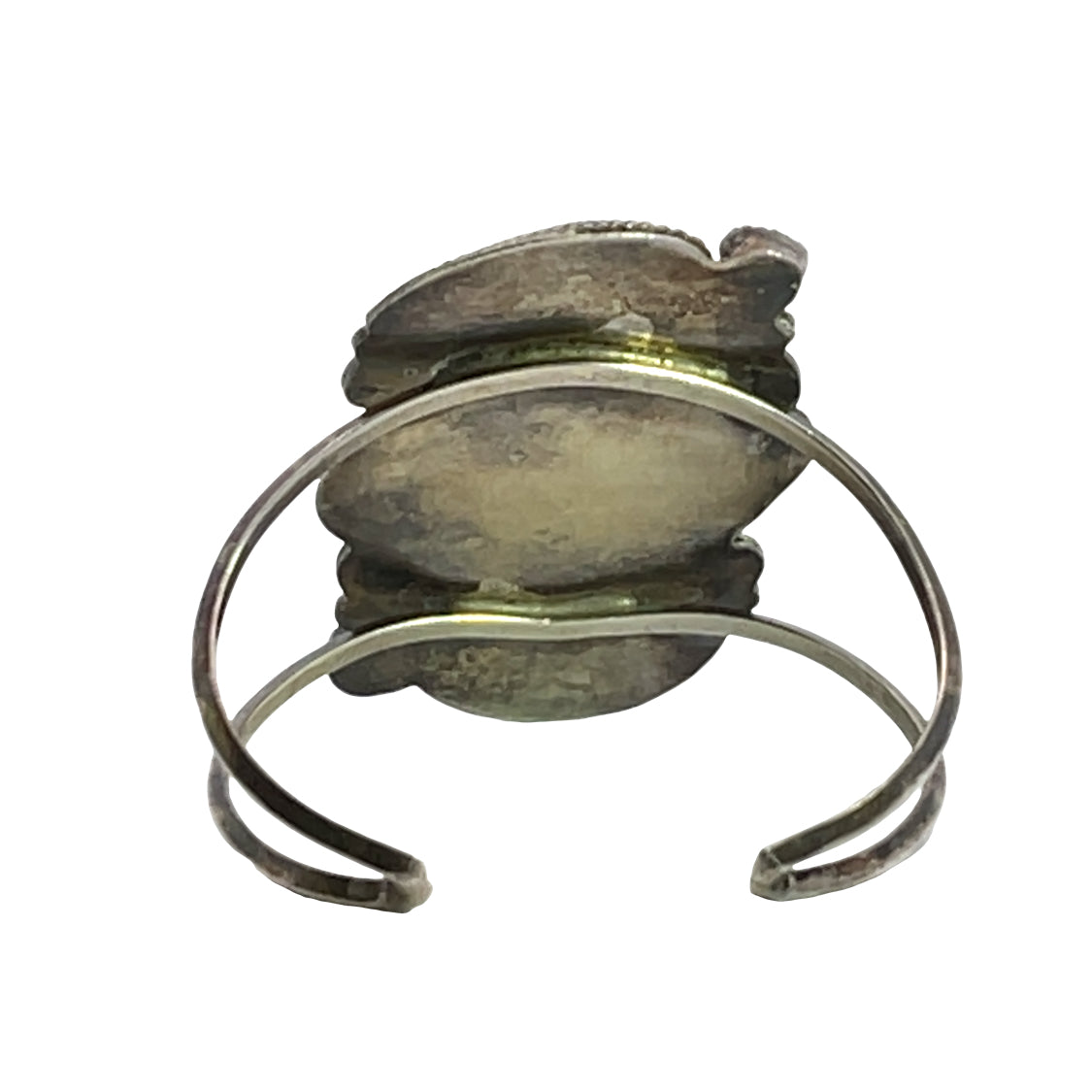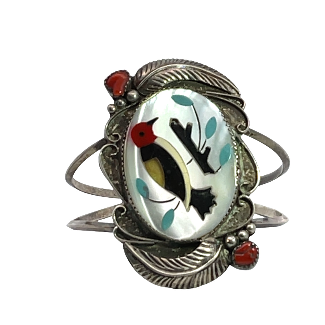 Description : The symbolism of a woodpecker has many meanings in the Native American tradition. The American woodpecker has a signature red head with white and black details on his body. The sound he makes can be identified throughout the forest. The woodpecker drills into the tree and extracts bugs that are his food. This sound can be heard for miles. In the Native tradition is a recognizable sound that is sometimes likened to the heart beat of the earth. The image of a woodpecker means perseverance, determination, and represents a connection to the physical and spiritual realms of the universe. The Zuni were noted for their precise and masterful inlay jewelry pieces. The split wire cuff style bracelet was a way to make a wide bracelet light and comfortable to wear. The oval inlay is 40mm long by 30mm wide.
