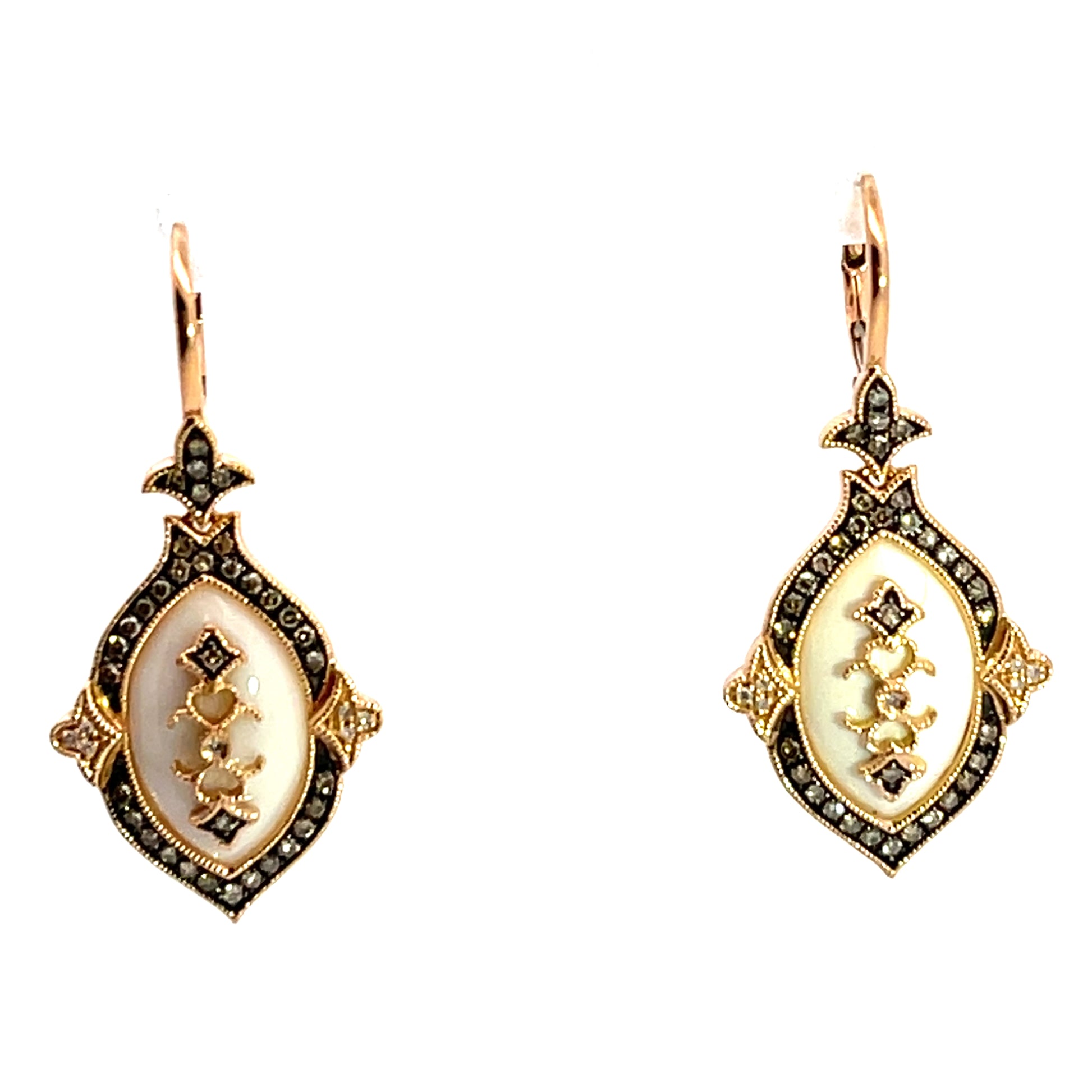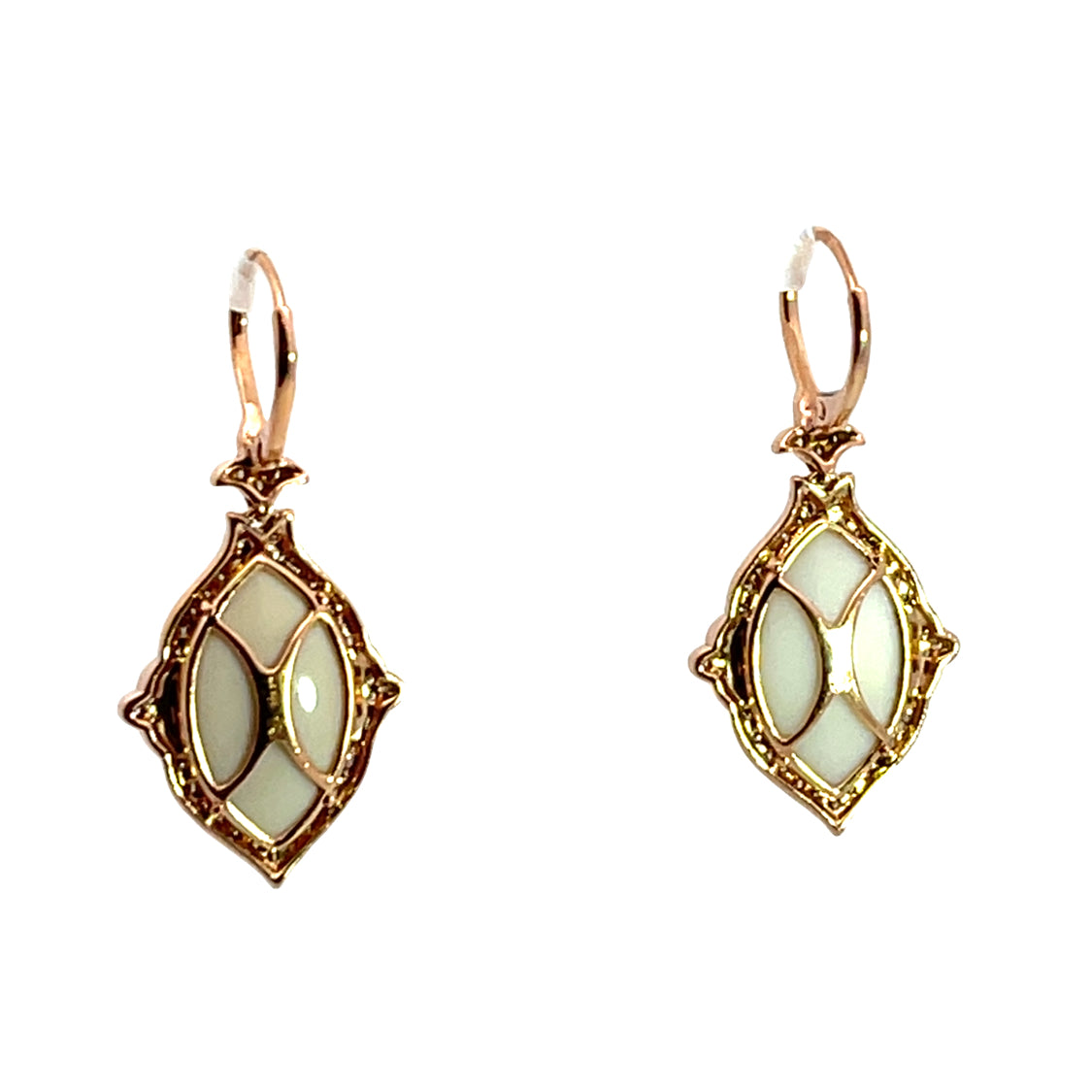 Description : White coral symbolises 'immortal fortune' and is a calciferous formation from living coral beds. These oval cabochons are adorned with 14K rose gold details surrounding them, and also inlaid into them. A diamond halo surrounds each coral oval, and provides a lot of sparkle. Lever back earwires are the best as they securely clasp together with a hinge. White coral is generally from Italy and is often used in jewelry.