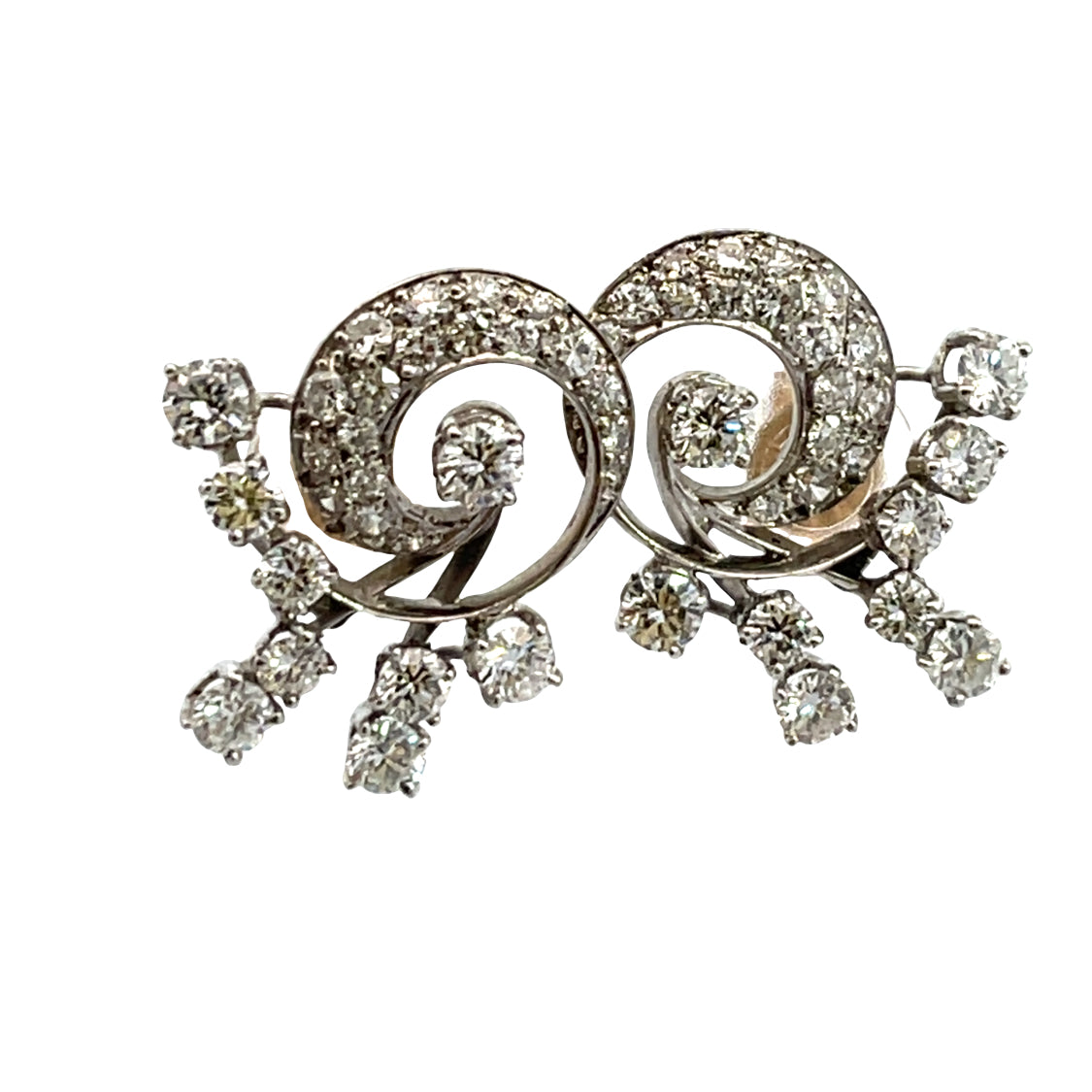 Description : There are 58 count, 2 carats of weight, natural white round faceted diamonds on these 14K white and yellow gold spiral earrings. We remember this style from our grandmothers in the 1940's. Spinning in opposite directions it is if sparks are flying off of the spiral making each earring look as if it is moving in space. Posts securely attach these earrings to your lobes. These earrings are a nostalgic reminder of times when cocktail parties and luncheons were popular. Lovely, vintage and noteworthy! They measure about 30mm across the spiral.