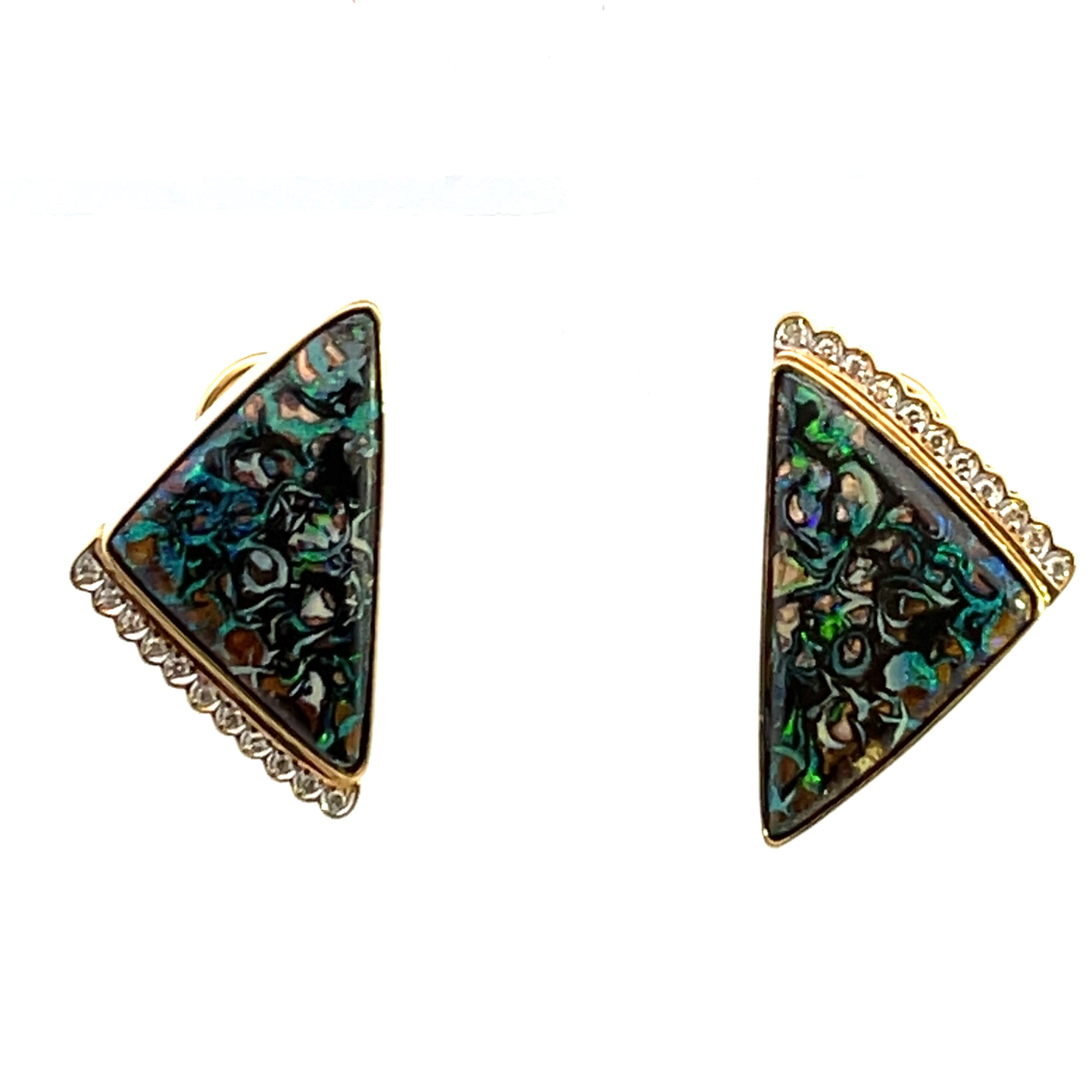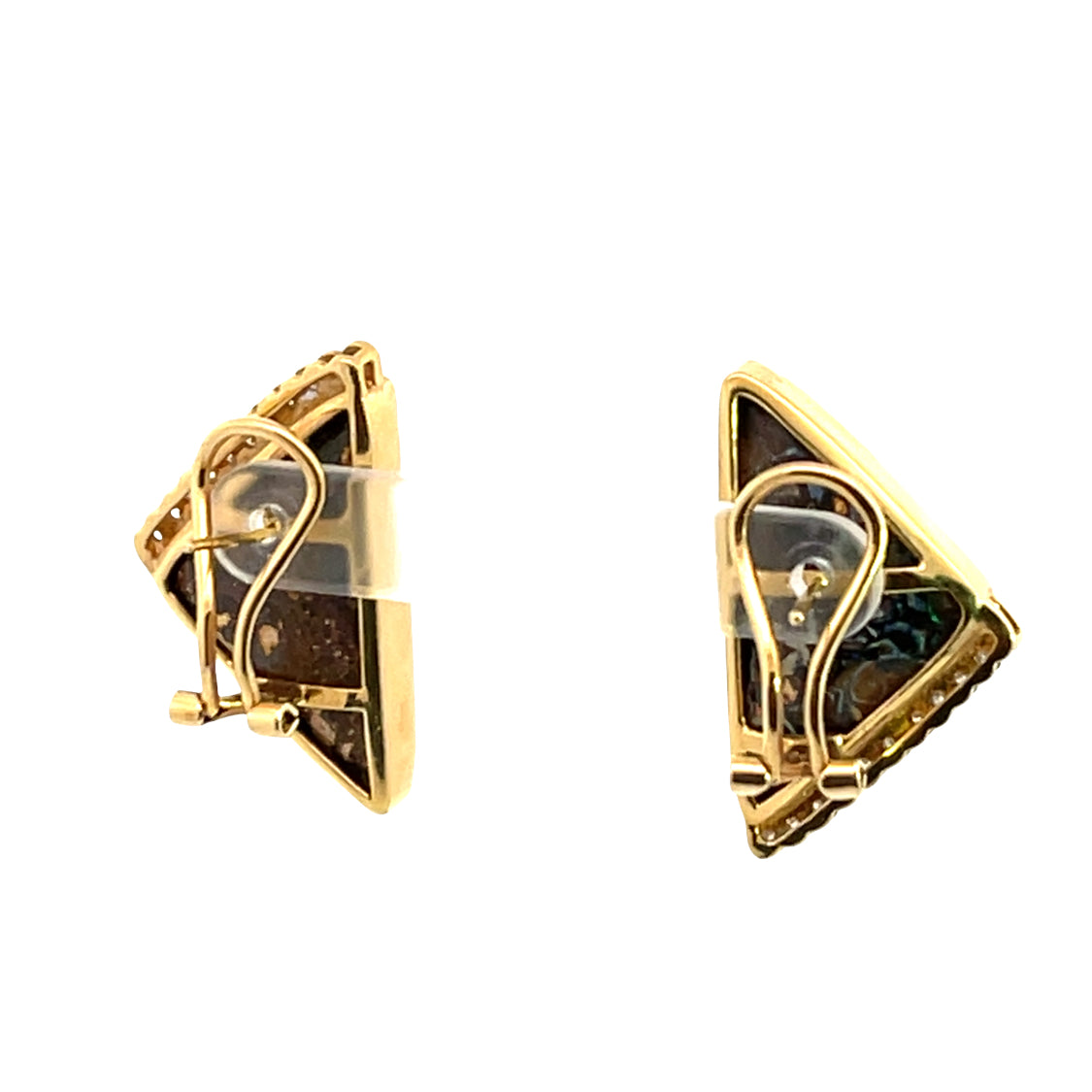 Description : Koroite is a form of opal that has been found in ironstone, exclusively in the Koroite fields of Queensland, Australia. This material has become increasingly rare. Opal generally forms in sedimentary material and softer materials like wood and bone, but ironstone is a very durable, and the black opal seams itself through the hard rock like opal ribbons displaying a delightful shimmer of 'play of color'. Two matching slices of koroite are made into earrings, set in 18KY gold and accented with 1.5mm round white natural diamonds in an asymmetric style on either side of the ear. Built with security in mind, the omega backs affix these post earrings safely to your ear, and this feature prevents them from drooping. Rare, intriguing, and very elegant, these earrings make a big statement!