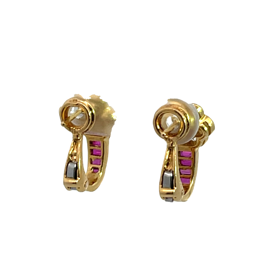 Description : Mecan Elde was a Turkish company, located in Istanbul that was known for their fine manufacturing. of luxury jewelry. These gorgeous 18KY gold, diamond and ruby floral earrings are stamped with the maker's hallmark. Petite, feminine, and finely crafted, the weight of the gold is seen in the sturdy bezel set, 6 diamond circular design, with a purplish red, faceted round ruby in the center creating a flower. Ruby baguettes are channel set accents to look like stems. Heavy omega clips hold these earrings securely to your ear. A brilliant design, crafted in fine gemstones, and set in heavy 18KY gold is always the mark of a quality piece of jewelry.