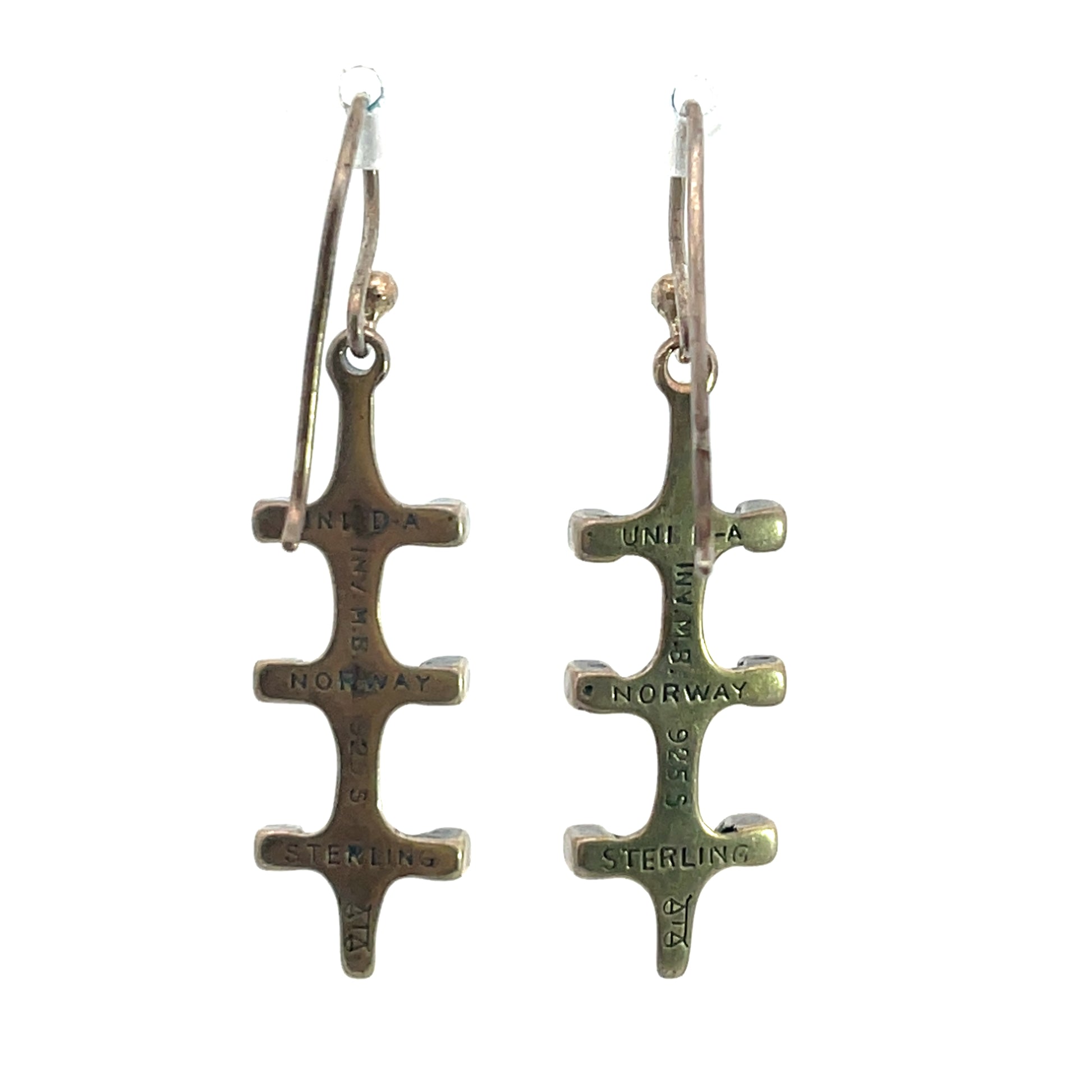 Description : Uni Anderson was David Anderson’s great granddaughter from Norway. Uni, born in 1930 worked with four other women jewelry artists manufacturing her designs, using native gemstones like tiger’s eye and Amazonite. She also managed the continued production of her great grandfather David. She was a progressive modernist in design style, which can be seen in this simple, yet elegant grid design pendant and chain, cast in sterling silver. The influence of her studies with Georg Jensen in the 1950’s in NYC can be instantly recognized. A nice length, these 35mm long earrings are on shepherd’s hooks. They are historic pieces, clearly signed by the 94 year old artist. They match the necklace in our inventory. This is a striking and very rare set.