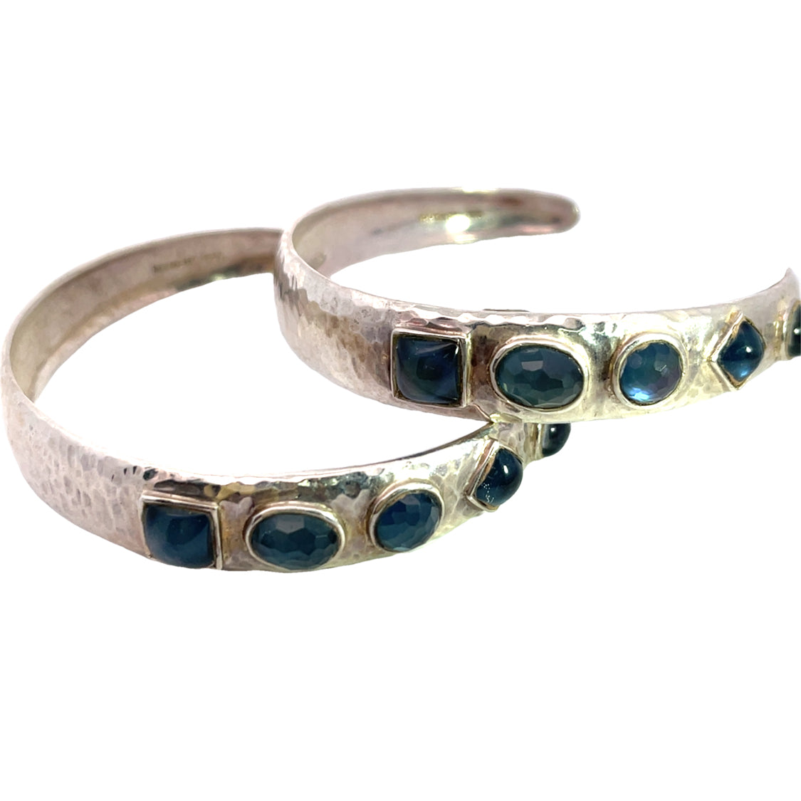 Description : Who doesn't love a pair of dramatic, large, hammered formed hoop earrings? Ippolita is not shy about the size of these 55mm across hammered sterling silver hoop earrings with posts. Mother of pearl backs the translucent blue topaz cabochons giving the various shaped gemstones a magnificent depth of color and shimmer. Not for the feint of heart, these earrings are definitely statements of style and class.