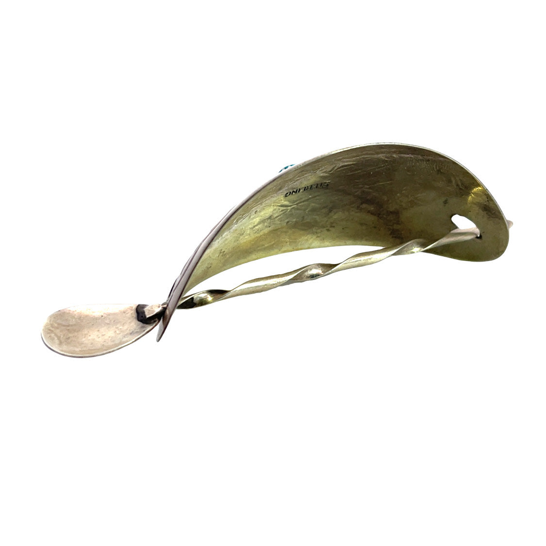 Description : Hair was of great spiritual importance to the Native American tribes. The Native hair was generally thick and always very long, and a considered a communicator to the ancestors. This pin is for someone with long, thick hair. A stamped, hand formed sterling silver oval is made to accommodate a copious amount of hair, and then a pin is fashioned to secure the hair. The decorative twists in the pin also serve a function of securing the hair inside the pin. A bright blue natural turquoise nugget is bezel set on top and represents the color of the South Western Sky. This would make a lovely gift for a December baby as turquoise is the birthstone.