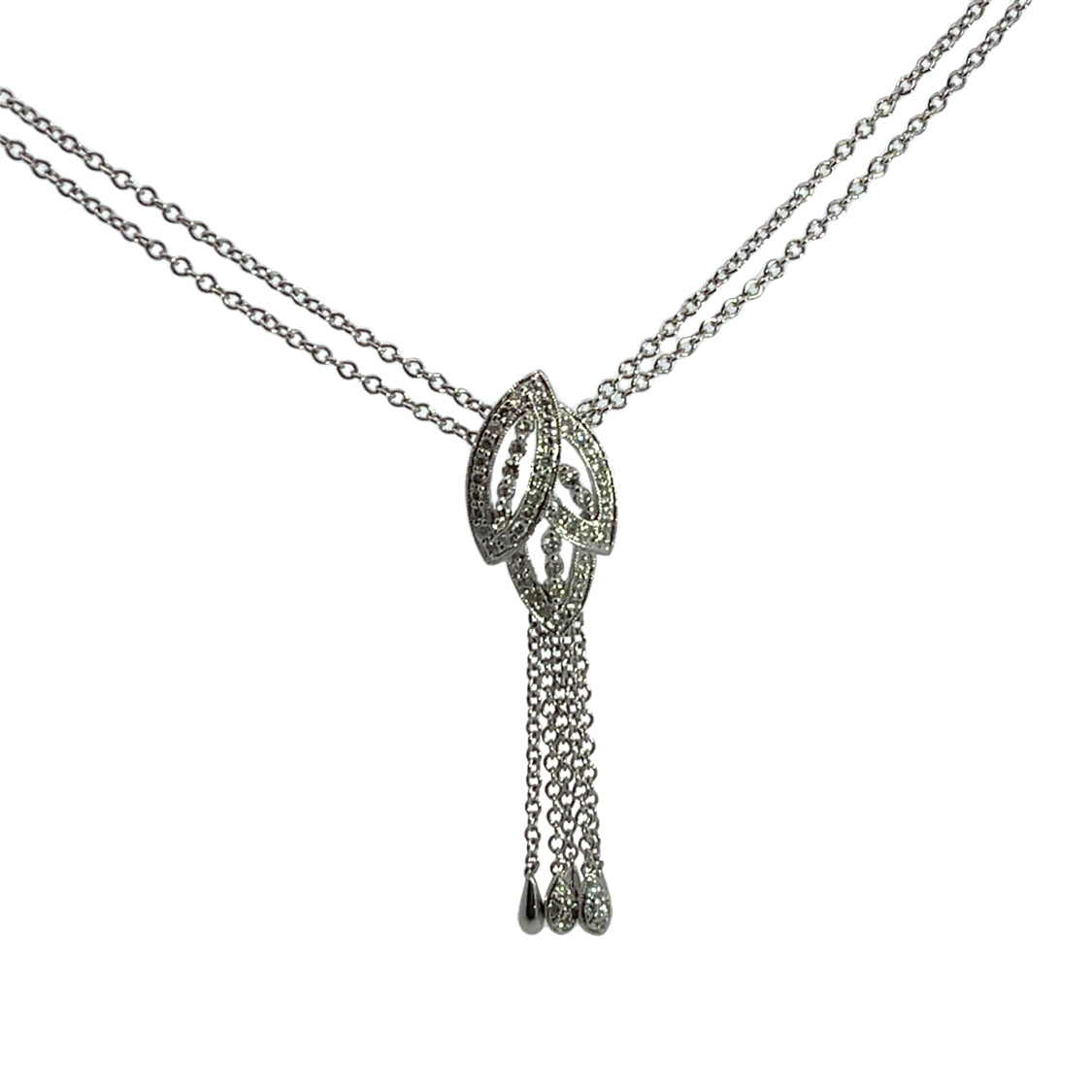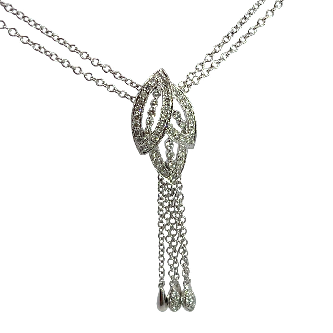 Description : What a fun piece this is! Three marquise, 14K white gold shapes nest together as a pendant slide with a doubled up chain. A waterfall of chain fringe falls cleverly from the bottom, and .50 carat of round white melee diamond accents form around the perimeters of the marquise shapes that create a pendant. This is a short 15 inch necklace that would drape perfectly around the neck. Secured with a lobster clasp this necklace is easy to wear and is an unusual, fresh design.
