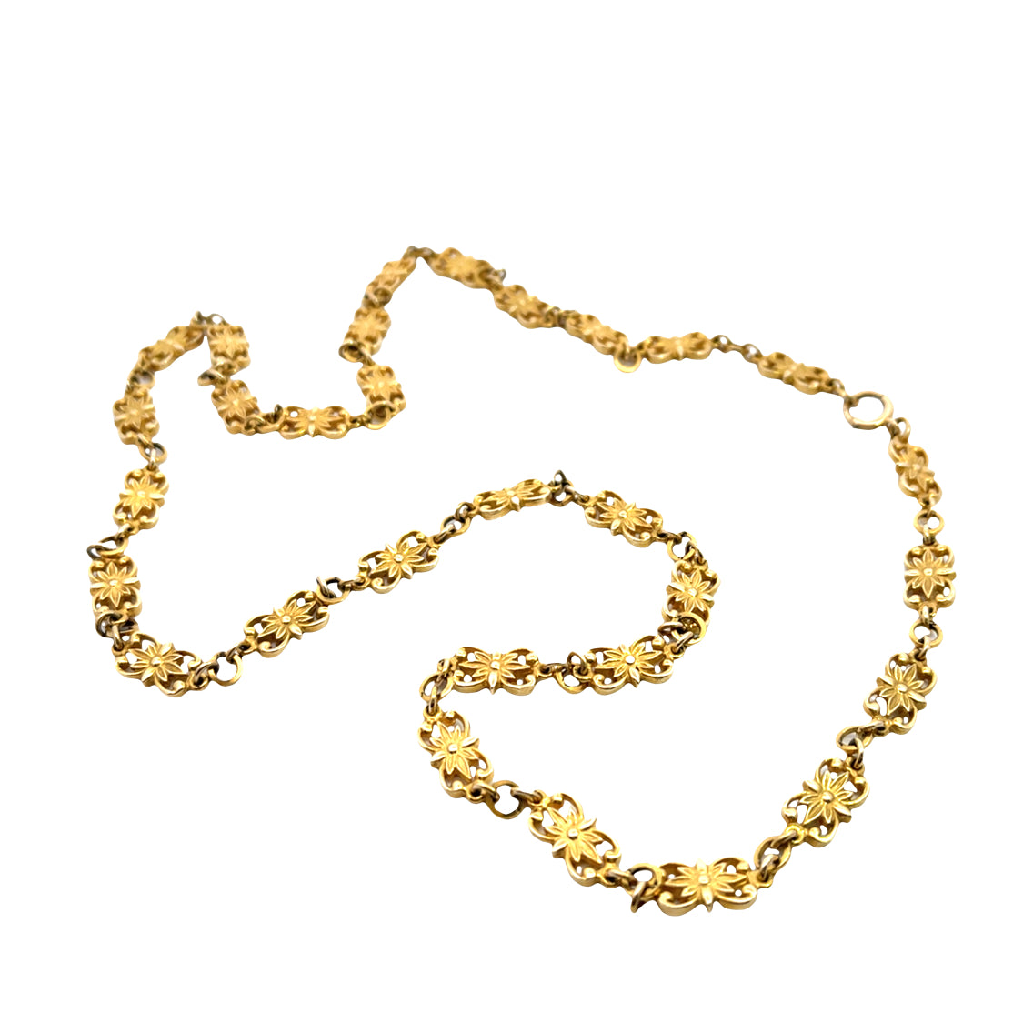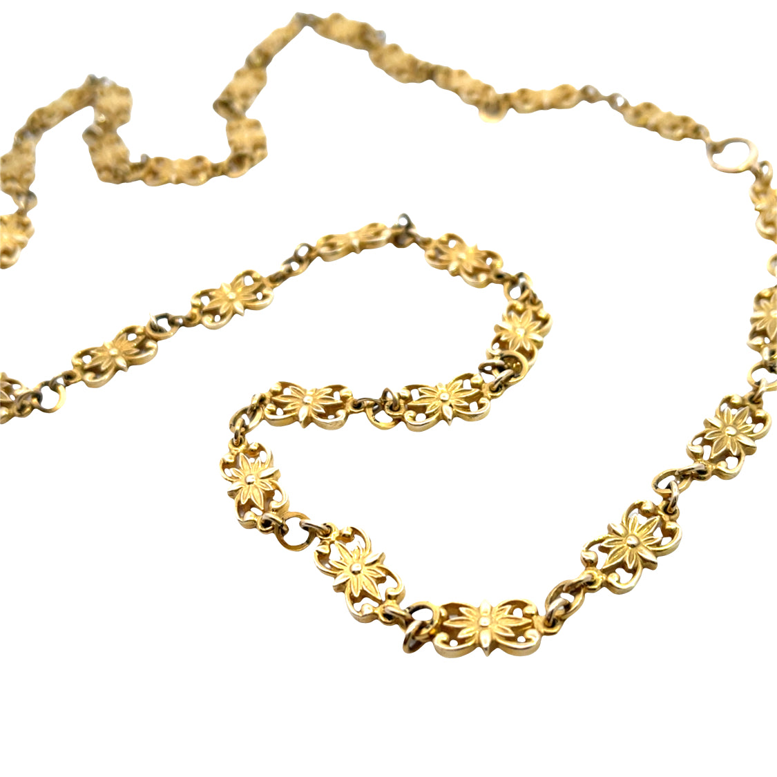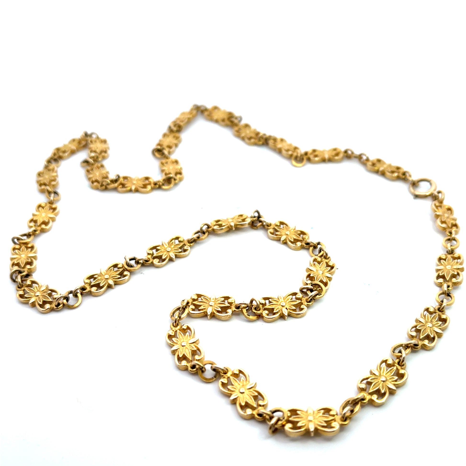 Description : The weight of this floral Victorian chain is a full 48 grams. This necklace tests for 14KY, but is a warmer color and appears higher karat gold. You can feel the quality of design and significant weight holding it in your hands. The links are flowers that are cast, and then hand finished and assembled. 18 inches long fits most necklines and looks great for layering.