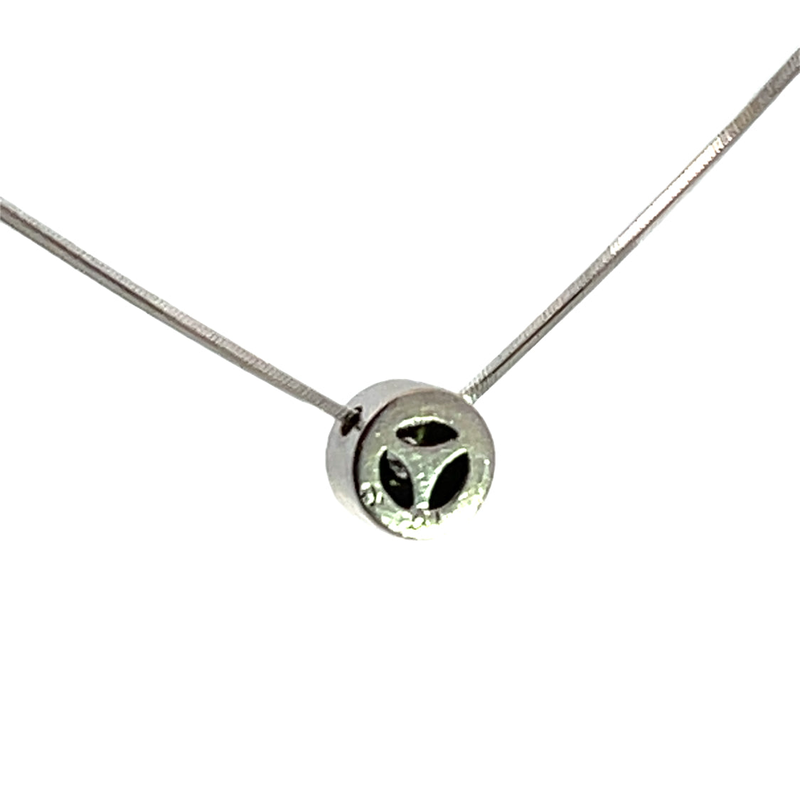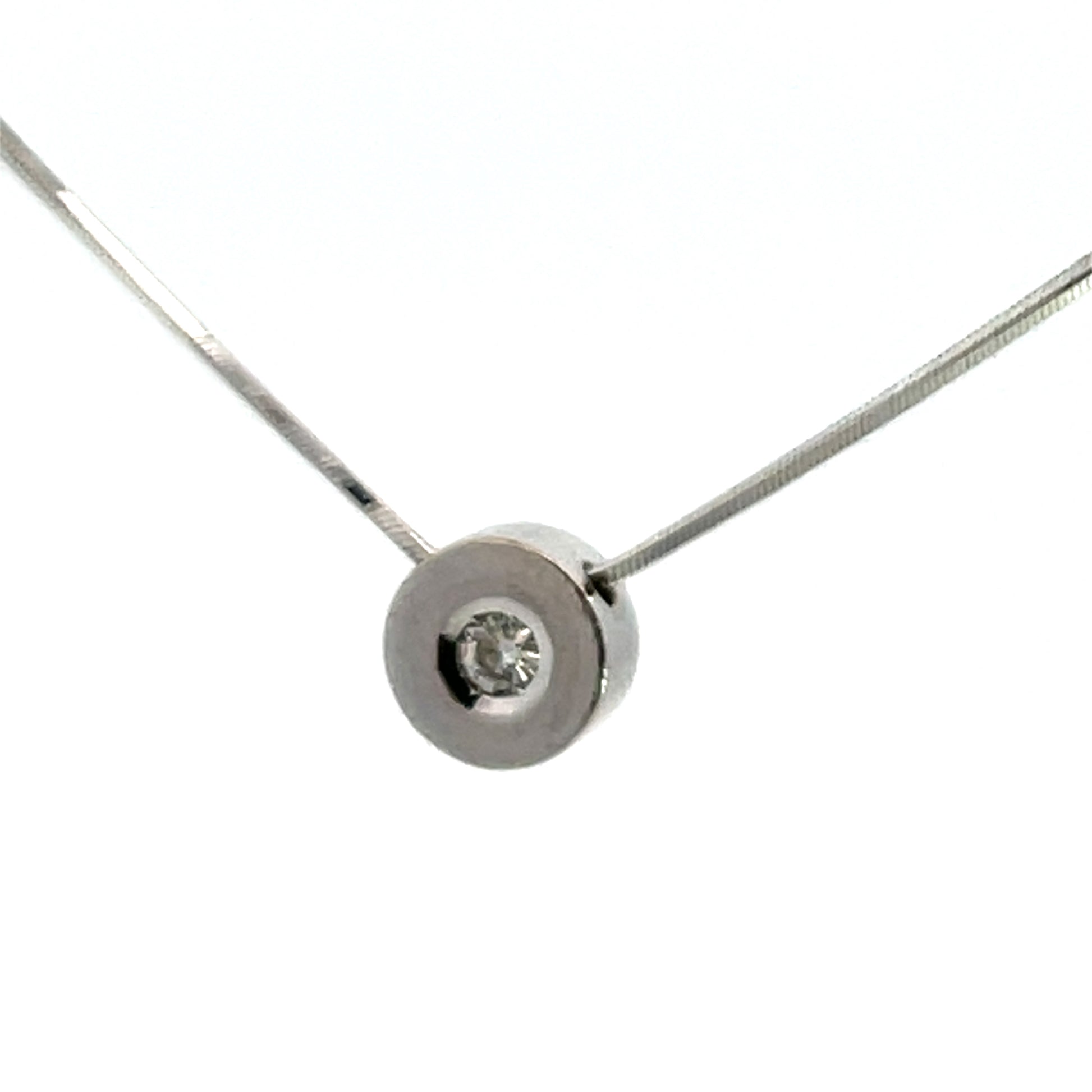 Description : A minimal shadow box setting surrounds a .50 carat weight natural round white diamond in a prong setting. This elegant style is designed for an active person. Set within an 18K white gold snake chain, the diamond is recessed as to protect it. Very simply set, the back is open to let the maximum amount of light shine through.
