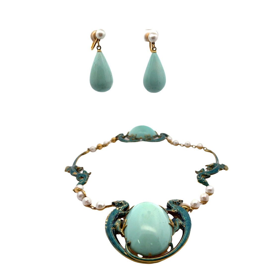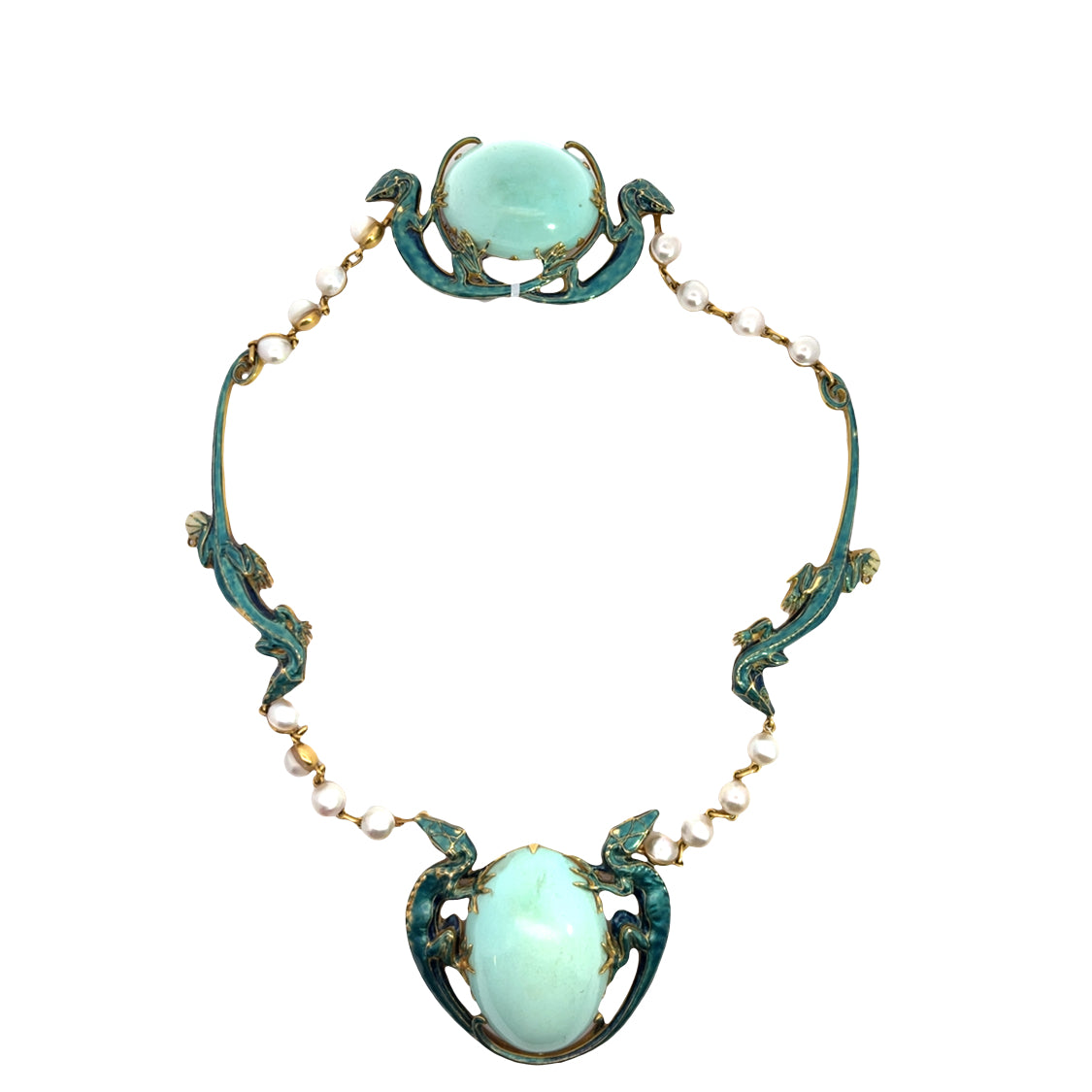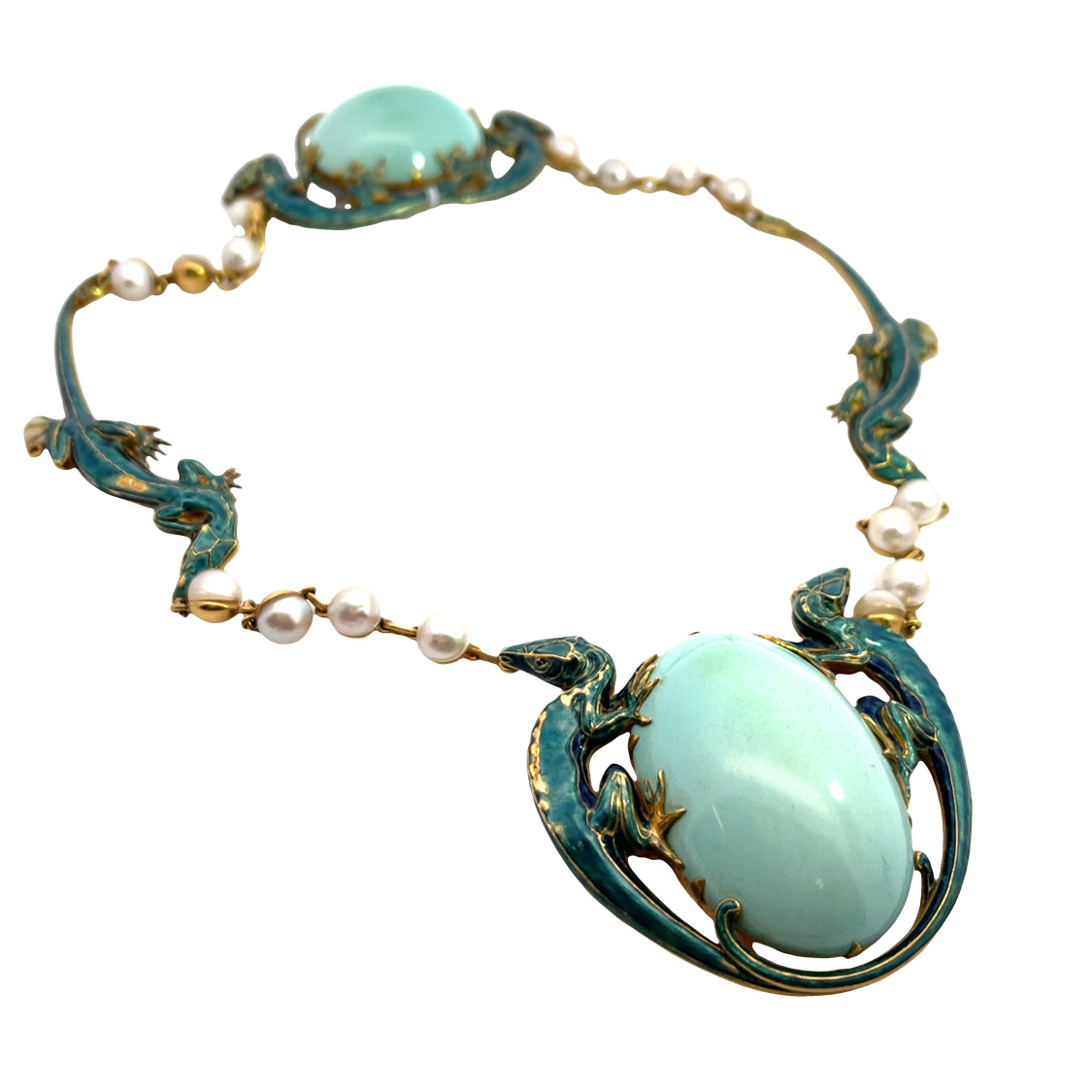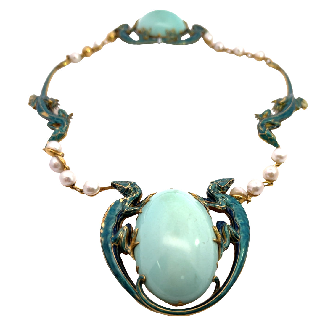 Description : The drop earrings of turquoise and pearl may have been removed from this necklace. An exquisite, museum worthy masterpiece of turquoise, pearl and enamel, we have determined this necklace needs more research regarding its history. It is unsigned, but has the style and craftsmanship worthy of a Lalique design. Enamel lizards hold tightly the centerpiece, 18KY gold bezel set massive pale blue turquoise cabochon, which is possibly Persian. The cultured pearls are hooked together to make this necklace sit on the neck perfectly. The clasp of turquoise precisely offsets the center. The two turquoise and pearl drops are modified screw back earrings and could be restored to the necklace. One of the most spectacular pieces of jewelry we have seen, this exquisite find of design, form, color and symbolism is an heirloom treasure of incomparable quality.