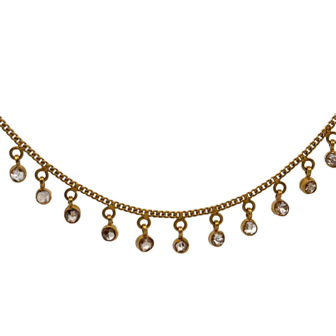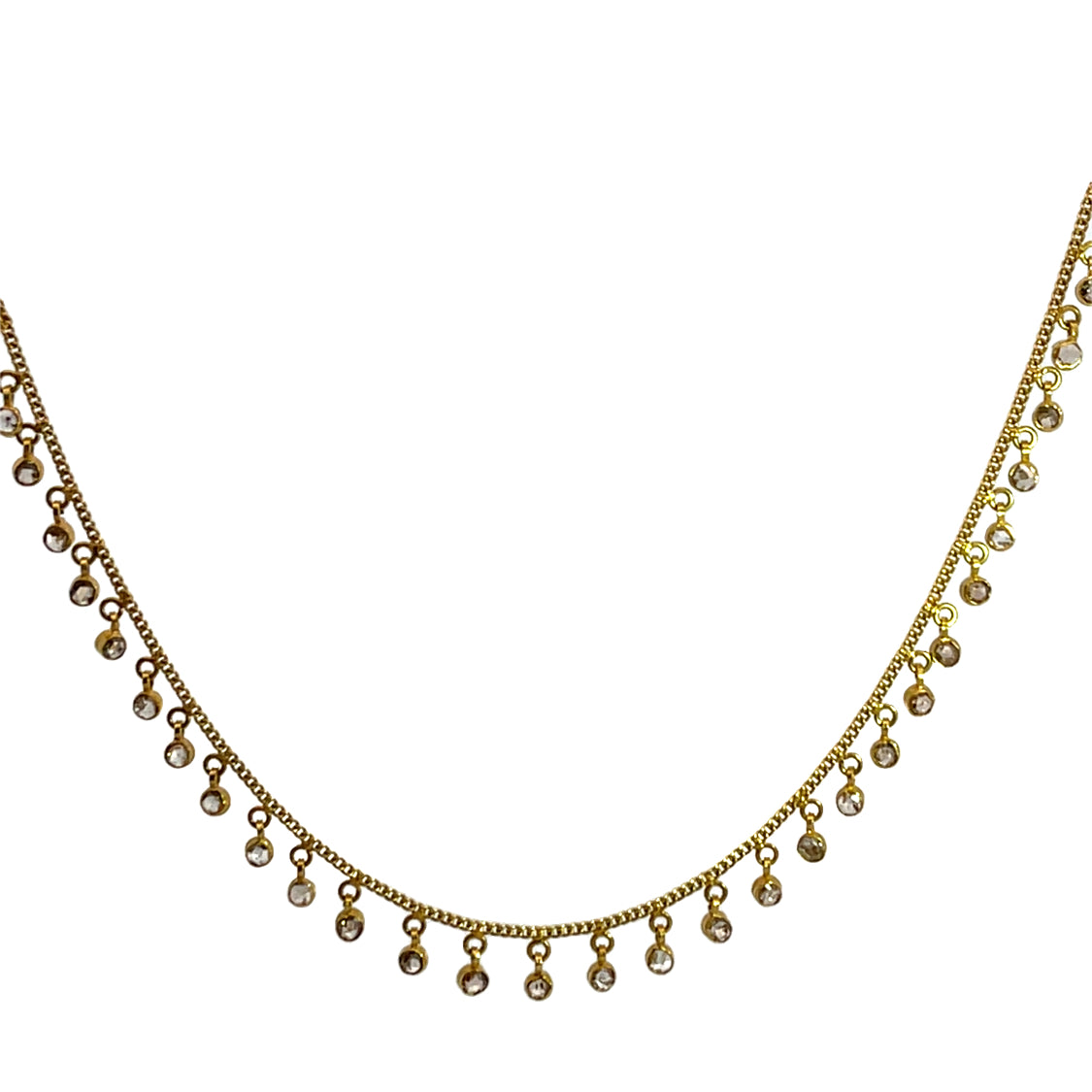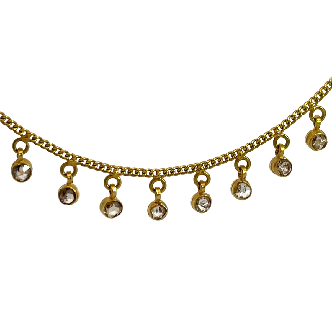 Description : Dozens of 2mm round yellow and cognac faceted round diamonds are bezel set and carefully placed on a 22KY gold chain with jump rings. This is an easy to wear piece that you can wear comfortably and a handmade piece of jewelry from India. The length is about 17 inches. It a beautful fresh look for spring, as yellow is such a happy color! The color of 22Ky gold is sumptuous and shows the quality of this stunning necklace.