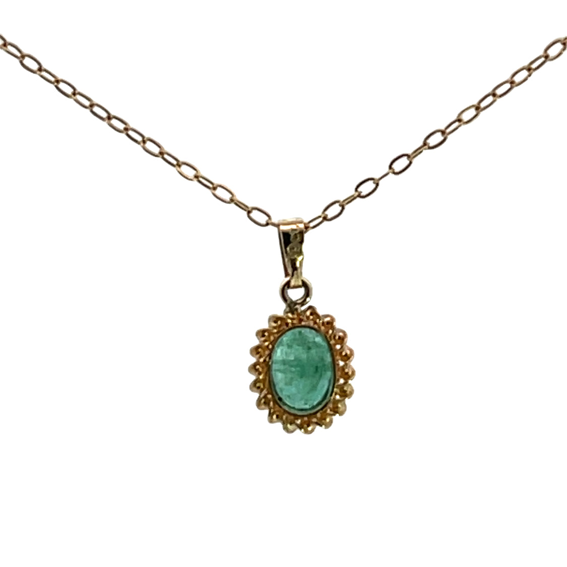 Description : The Birmingham Assay Office in England was established in 1778 to be a systematic method for determining gold quality standards. Based on a 100% scale, 9KY gold is 37.5% pure vs. the alloy, usually copper or nickel, that it was mixed with. Birmingham 9KY gold was introduced in 1854 and signified by an anchor. This feminine pendant has a 6mm x 8mm oval emerald that is bezel set and surrounded by a decorative open back plate, with a traditional bail on top. The newer chain is a 16 inch 1.5mm open link cable chain, and included with your purchase. Emerald is the birthstone for May.