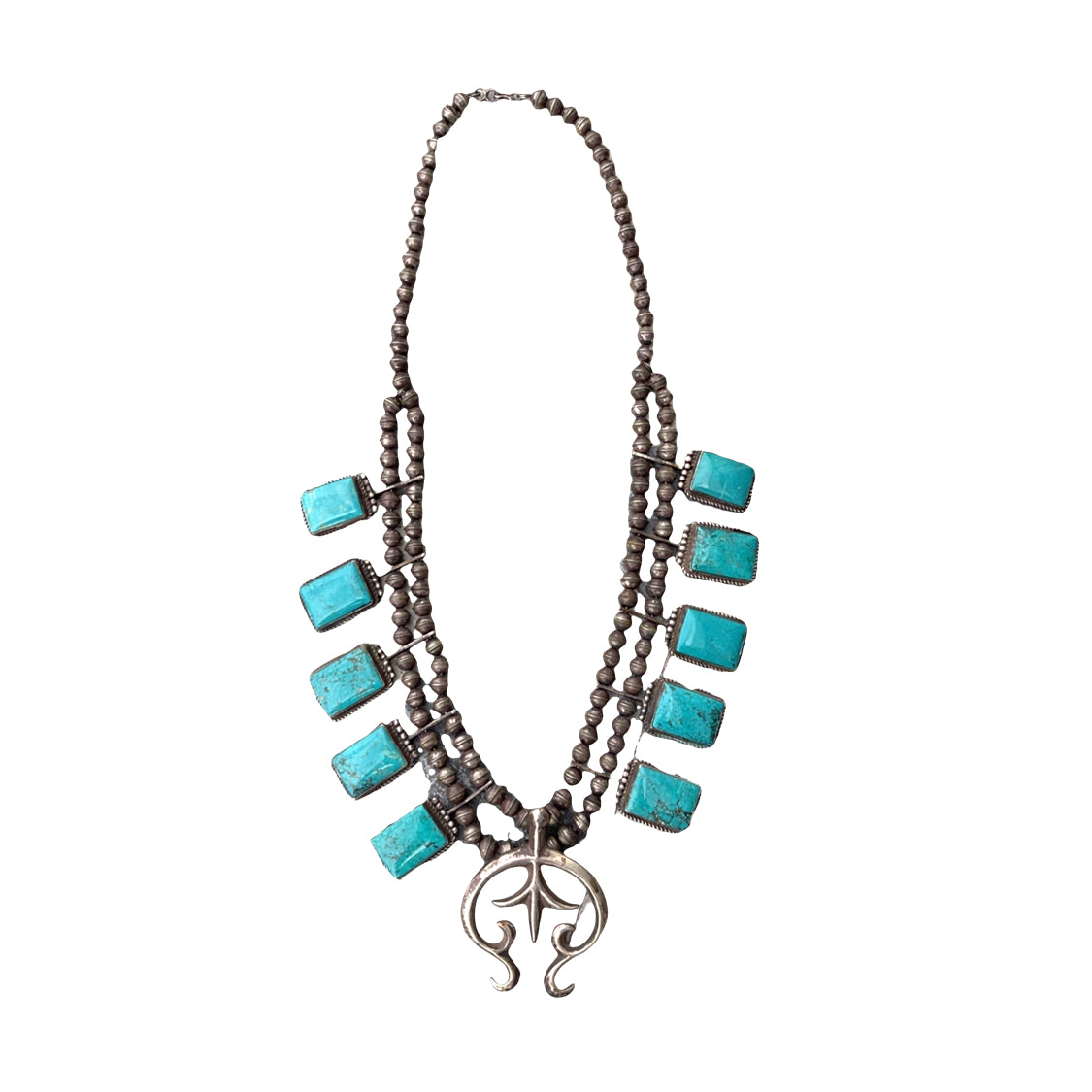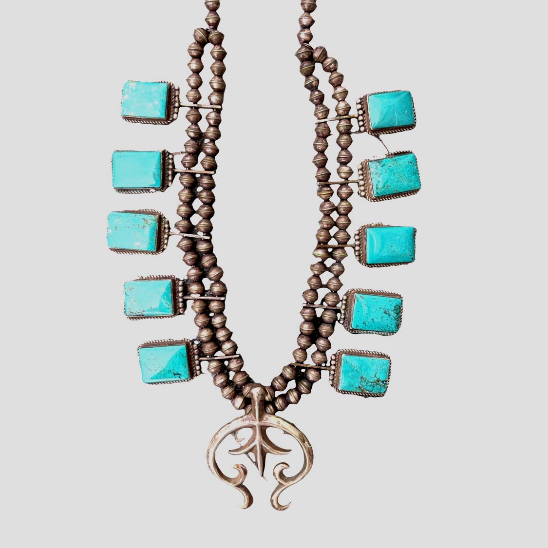 Description : Geraldine James is a Native American Dine/Navajo jewelry artist living and working in New Mexico today. She is known to use turquoise from the Kingman mine, and her signature design style is big, bold and beautiful. This squash blossom style necklace is certainly an example of her fine work. The Kingman mine was discovered by indigenous Native Americans over 1000 years ago. Its color of turquoise is known for its sky blue hues, but also it produces turquoise in greens as well. The mine is located in the Acerbate Mountains 14 miles outside the town of Kingman Arizona. What a blend of woman made jewelry, and ancient turquoise. The center Naja piece is a tufa cast, which means that it was created by pouring molten silver into a volcanic ash mold, and removed when it is cooled. The texture is a part of the tufa casting process. This necklace is unusual because it has square pieces of hand bezel set, well matched in color and size Kingman turquoise. This necklace is a cultural masterpiece in every way.