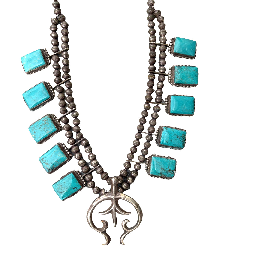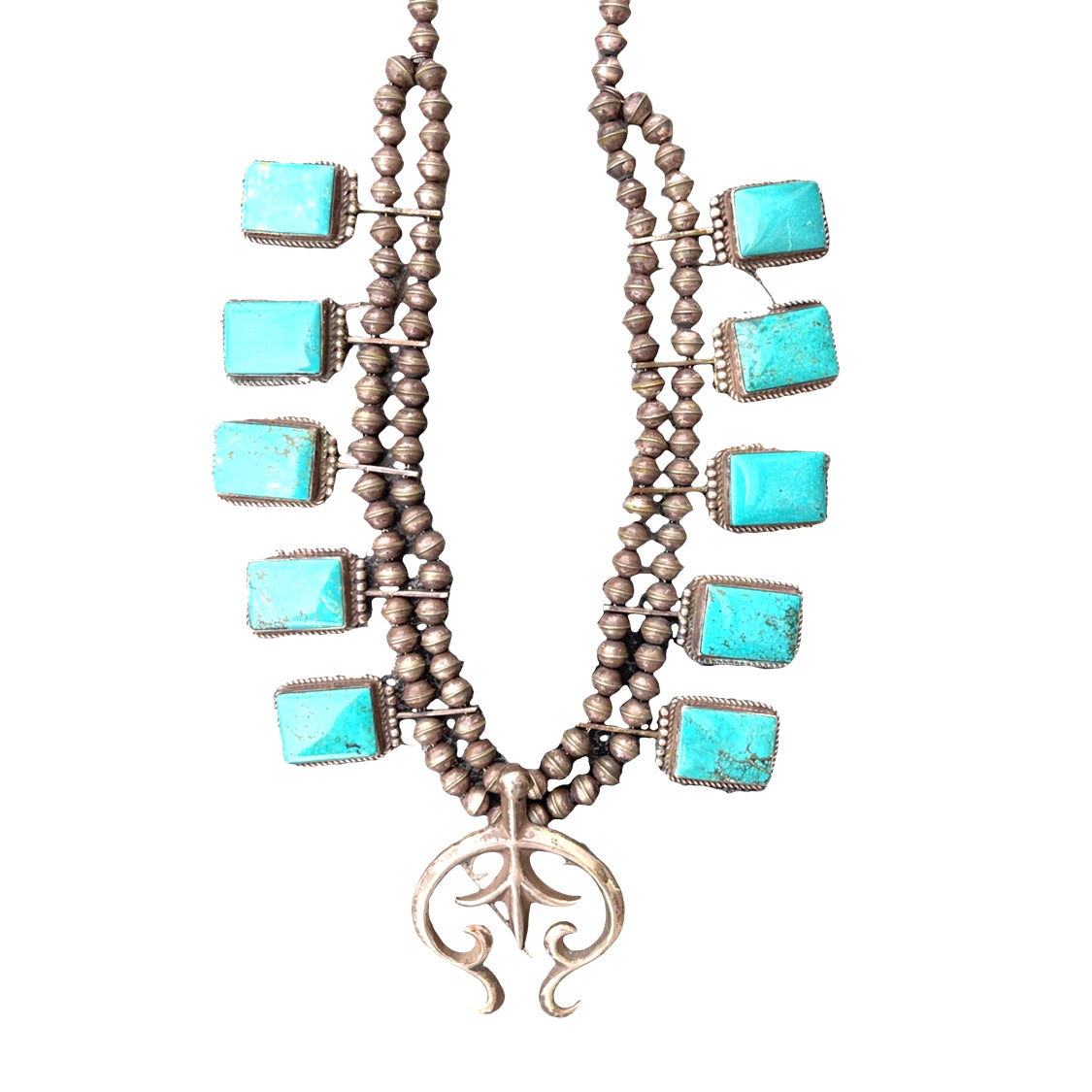 Native American Sterling Silver Kingman turquoise squash blossom necklace
