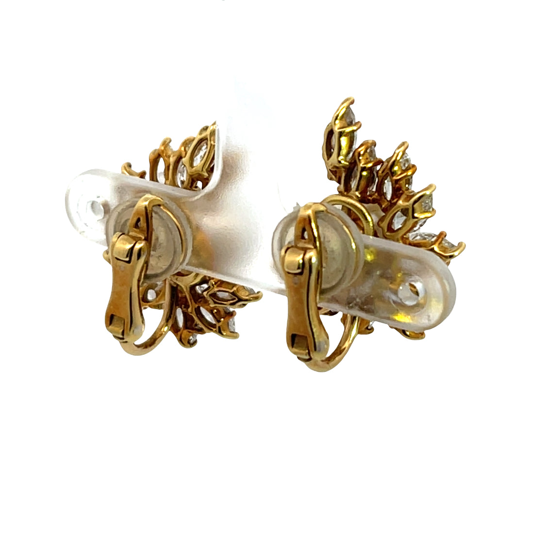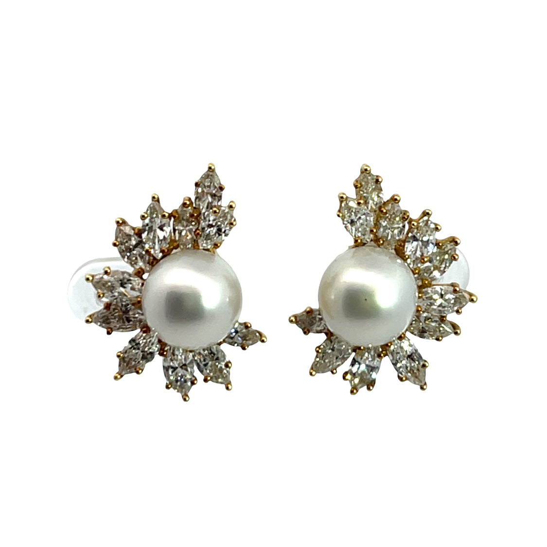 Description : The rare South Seas pearl is cultured in a bivalve mollusk called a Pinktada Maxima, which are oysters that grow the golden tone and white pearls used in fine jewelry. These two earrings each have an 11mm round, beautifully matched South Seas pearl. The earrings are a starburst design with a total of 3.2 carat weight of natural marquis shaped, prong set diamonds that are G/H color and VS quality of various sizes. Nicely weighted with an omega backing for weight distribution and security, they sit perfectly on the ear. Splendid in design, quality, and gemstones, these earrings are rare heirlooms designed to last for generations.