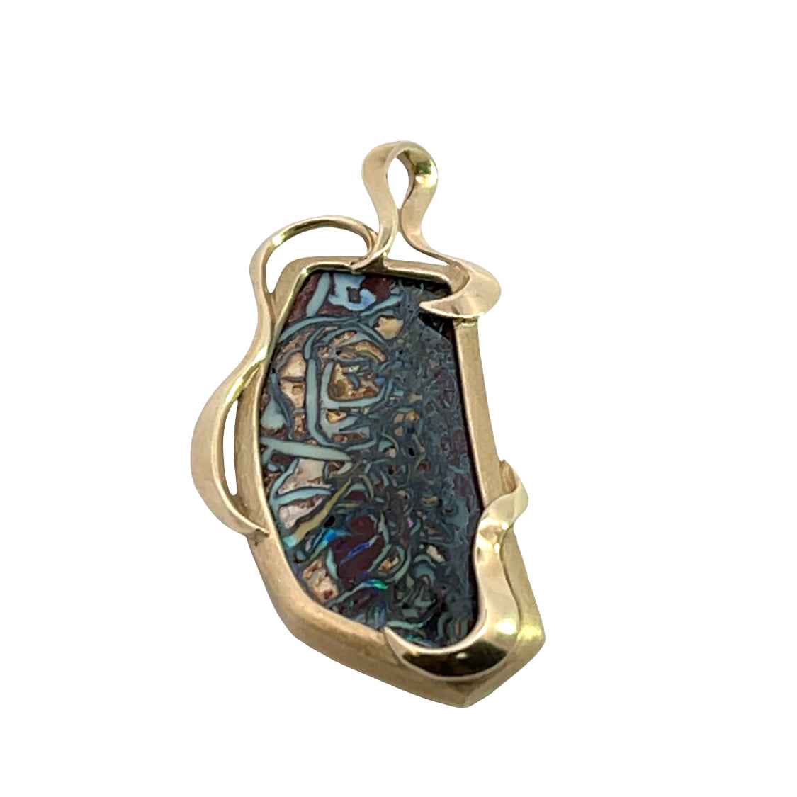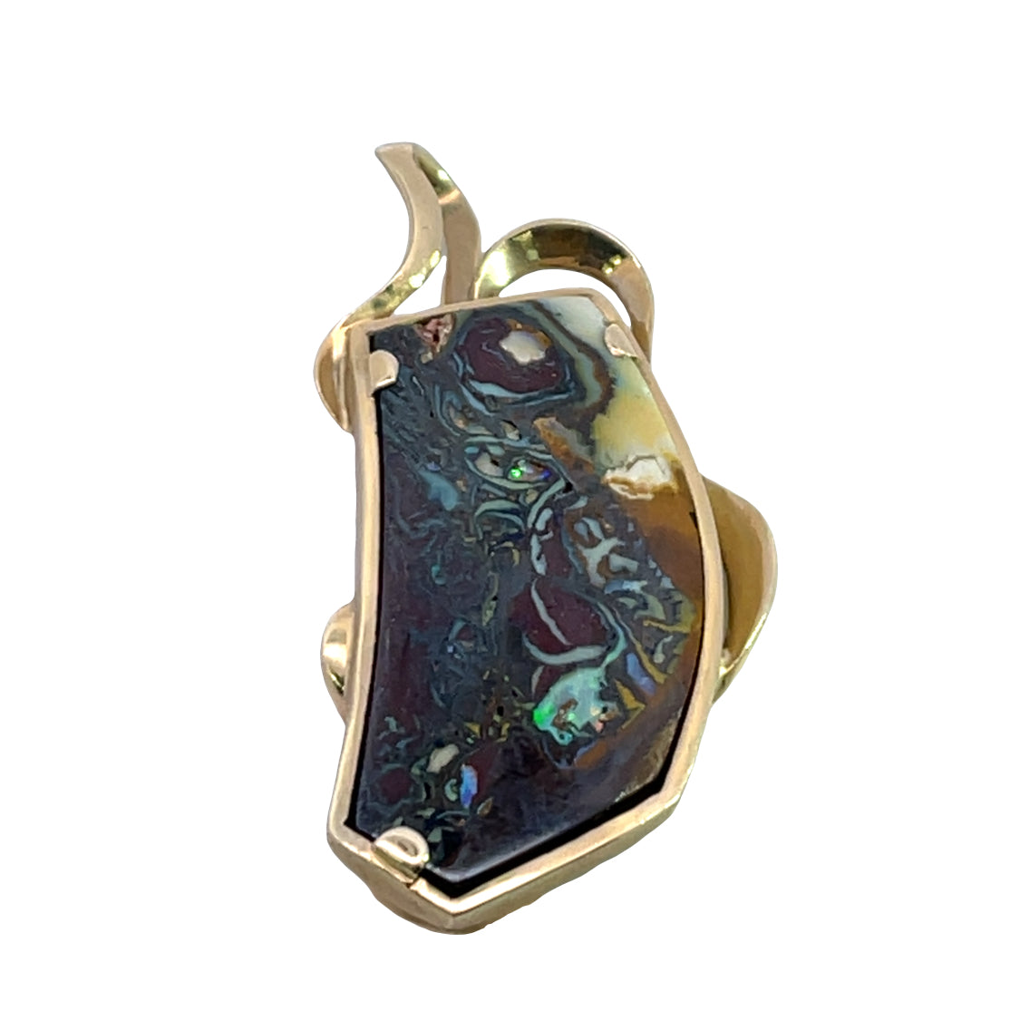 Description : Opal generally fills sedimentary cracks and can be found in wood, or bone, considered softer materials. Koroite opal is formed specifically in the Koroite fields in Queensland Australia. It is found in ironstone, a much harder rock. It is a highly sought after gemstone, and displays incredible play of color throughout the rock, and is cut specifically to highlight the opal ribbons found in the rock. This 40mm long pendant is a lovely match of 18KY gold in an organic ribbon-like form securely surrounding the rough Koroite opal rock. Rarity and fine craftsmanship are found in this unique pendant.