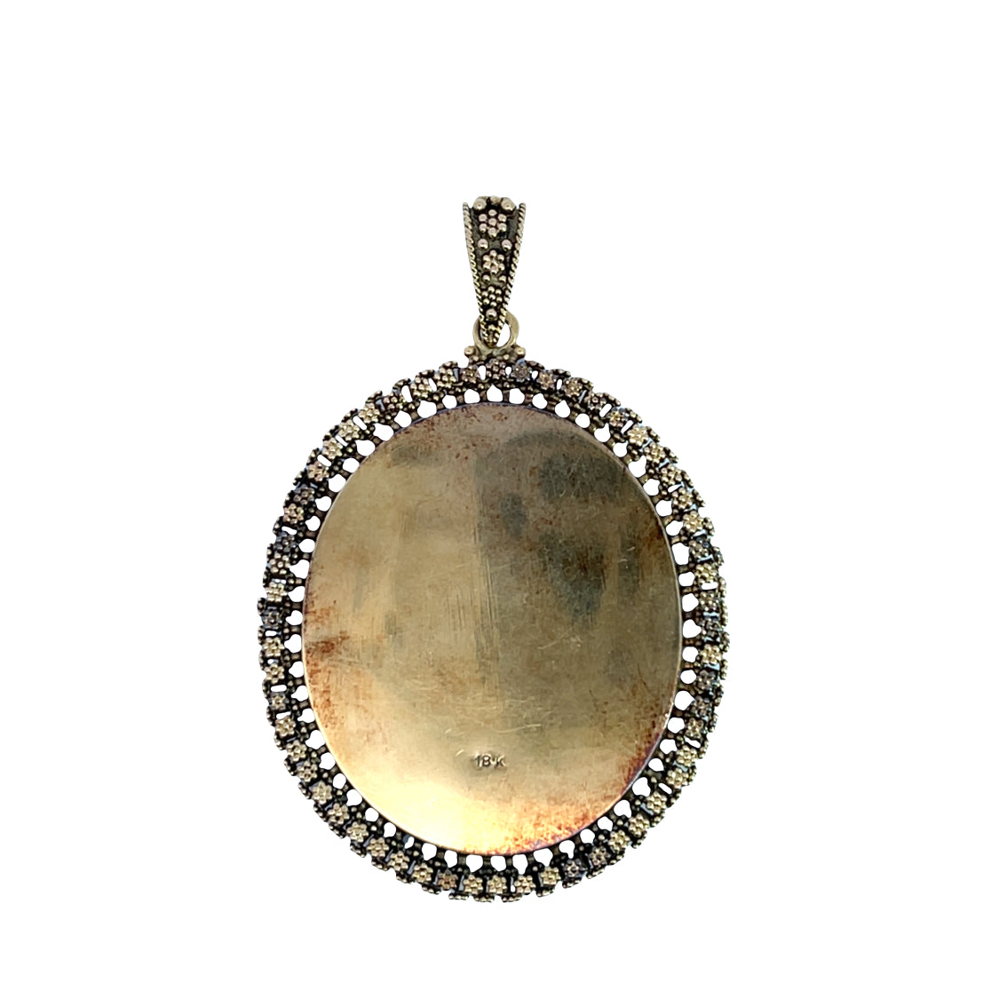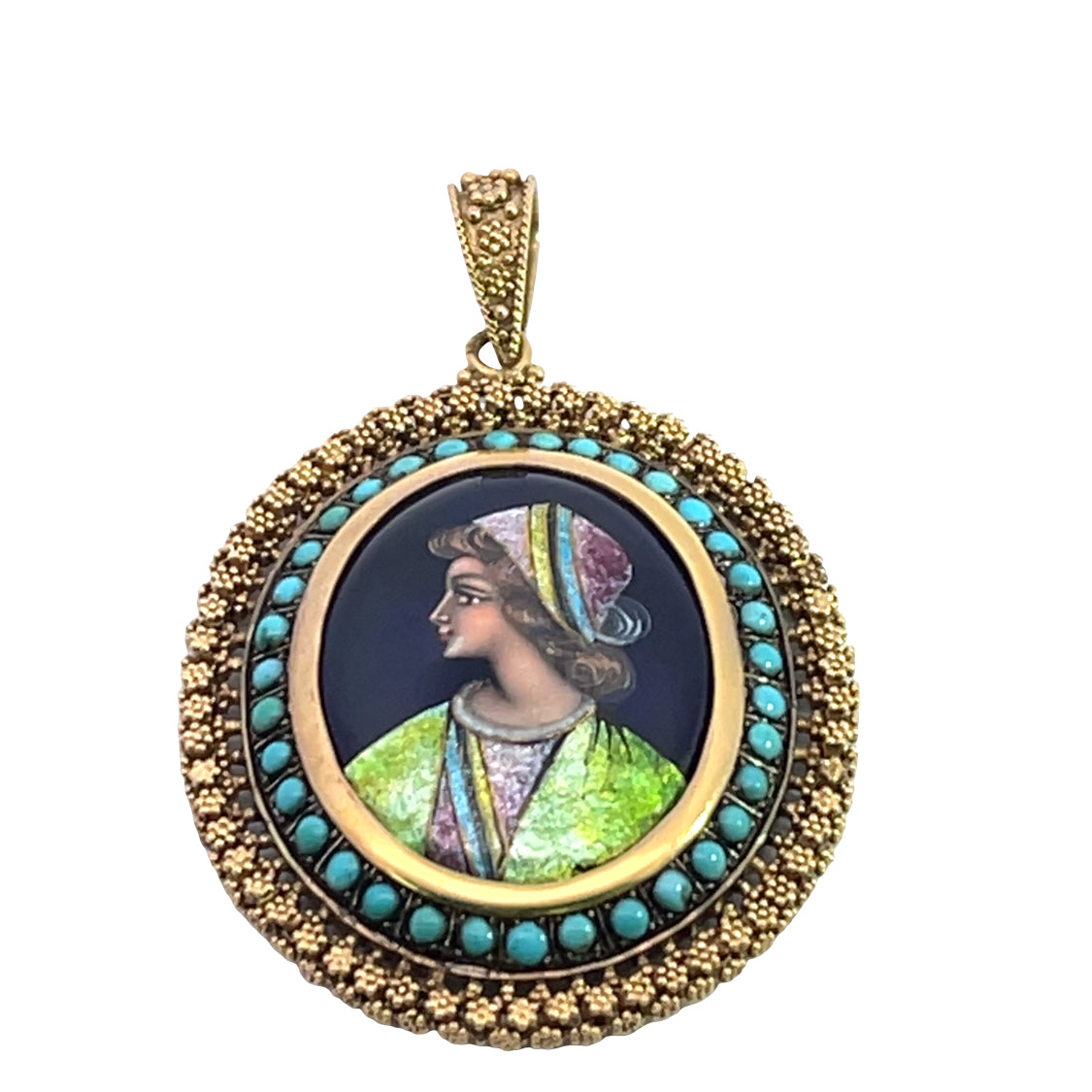 Description : Spritzer and Fuhrmann was founded by Paul Spritzer and Paul Fuhrmann, both highly skilled jewelers. They became a retail chain in the Antilles, and were honored by the Netherlands with a commemorative stamp. At one time they had over 20 stores in the Caribbean This 55mmx40mm pendant is a signature style of 18KY gold with granulation accents on the bail, and turquoise cabochons surrounding an enamel portrait of a young person. The enamel has foil backing in some areas to create a glistening surface. These pendants are rare to find in such perfect condition.