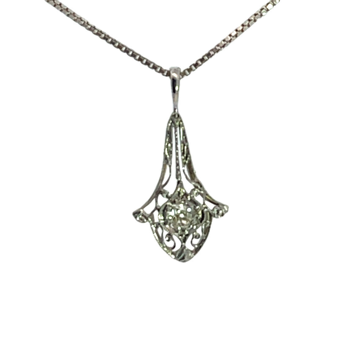 Description : A lovely feminine, sculptural 18Kwhite and 14K white gold bell shaped pendant holds a prong set round white faceted diamond in the center, with milgrain detail and round white accent natural diamonds. Light and delicate this pendant is a great example of the Art Deco style of architectural design. The Art Deco movement began in the late 1920's and was influential up until about 1940. The open back allows the light to show through the stones, giving it an extra bit of sparkle! Diamond is the birthstone for April. Chain is not included.