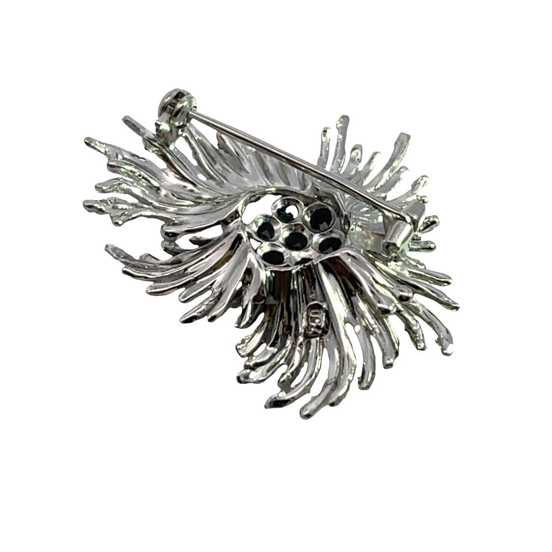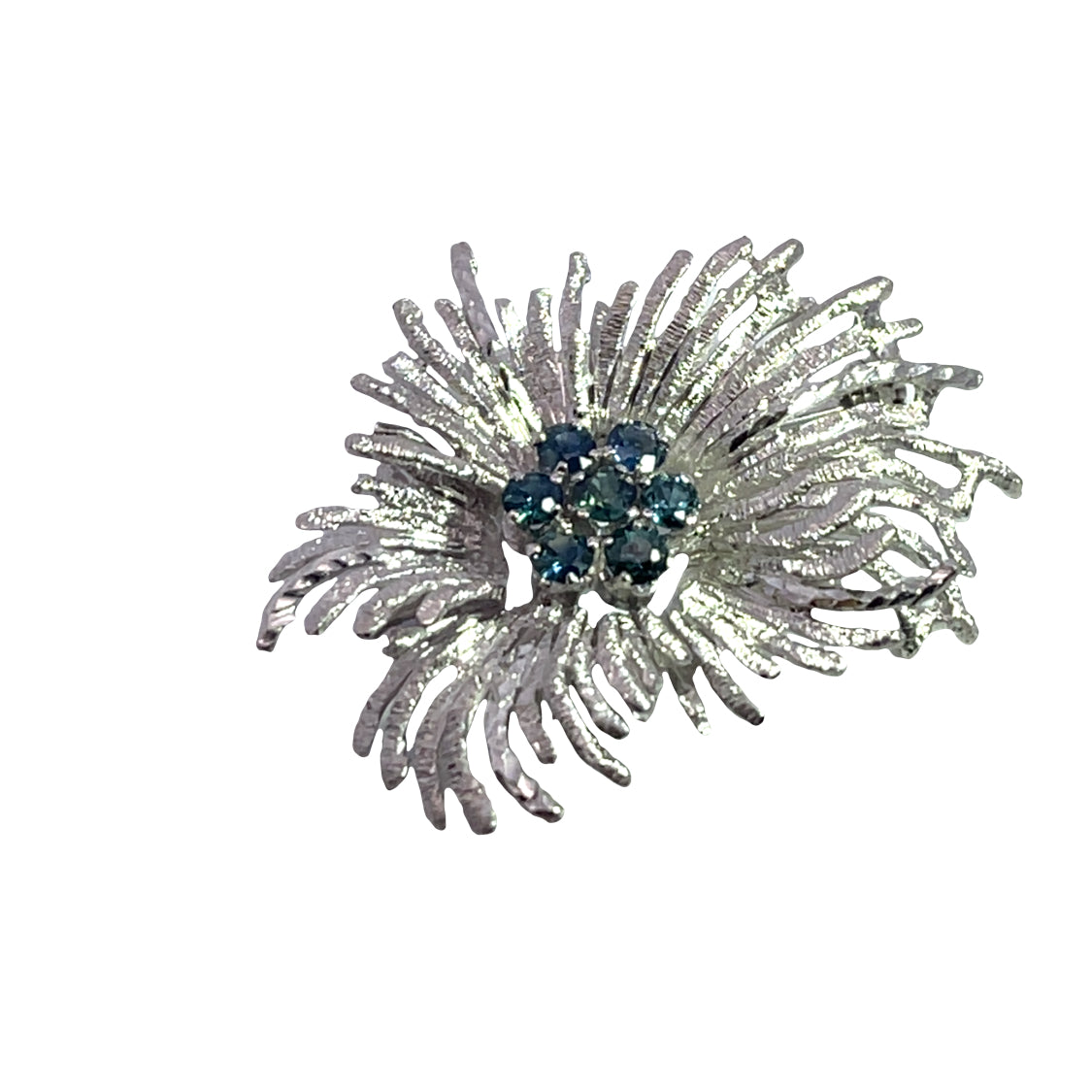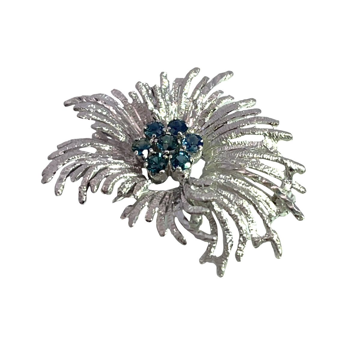 Description : An organic burst of 18K white gold hosts a cluster of 7, round faceted bluish green sapphires. This festive piece of jewelry would look great on any scarf, or lapel. Typical of a modern style, it is an asymmetrical form that looks wild and natural. Cast in gold and hand set with sapphires this brooch is destined to be a classic staple in your jewelry box. Sapphire is the birthstone for September.