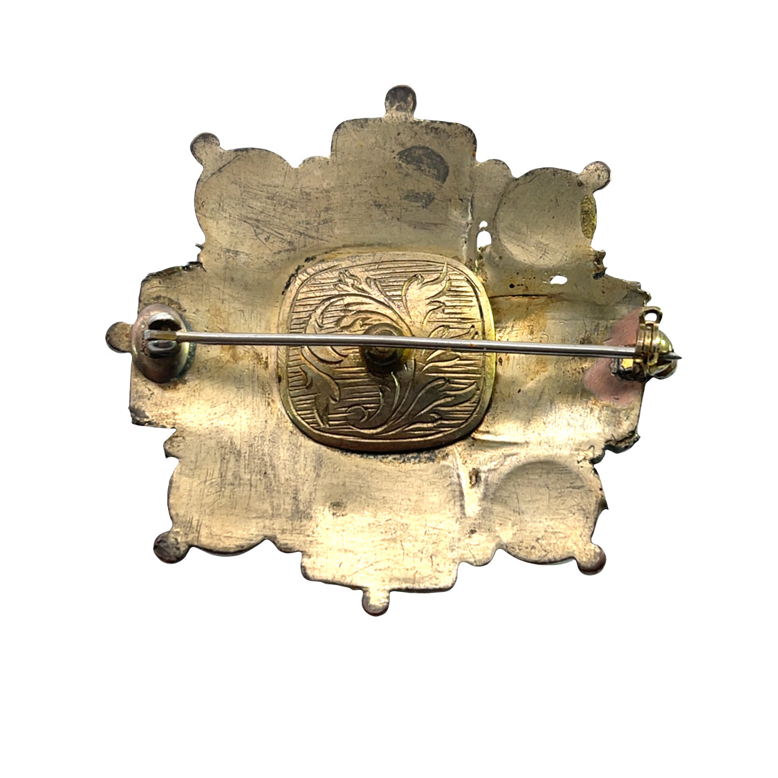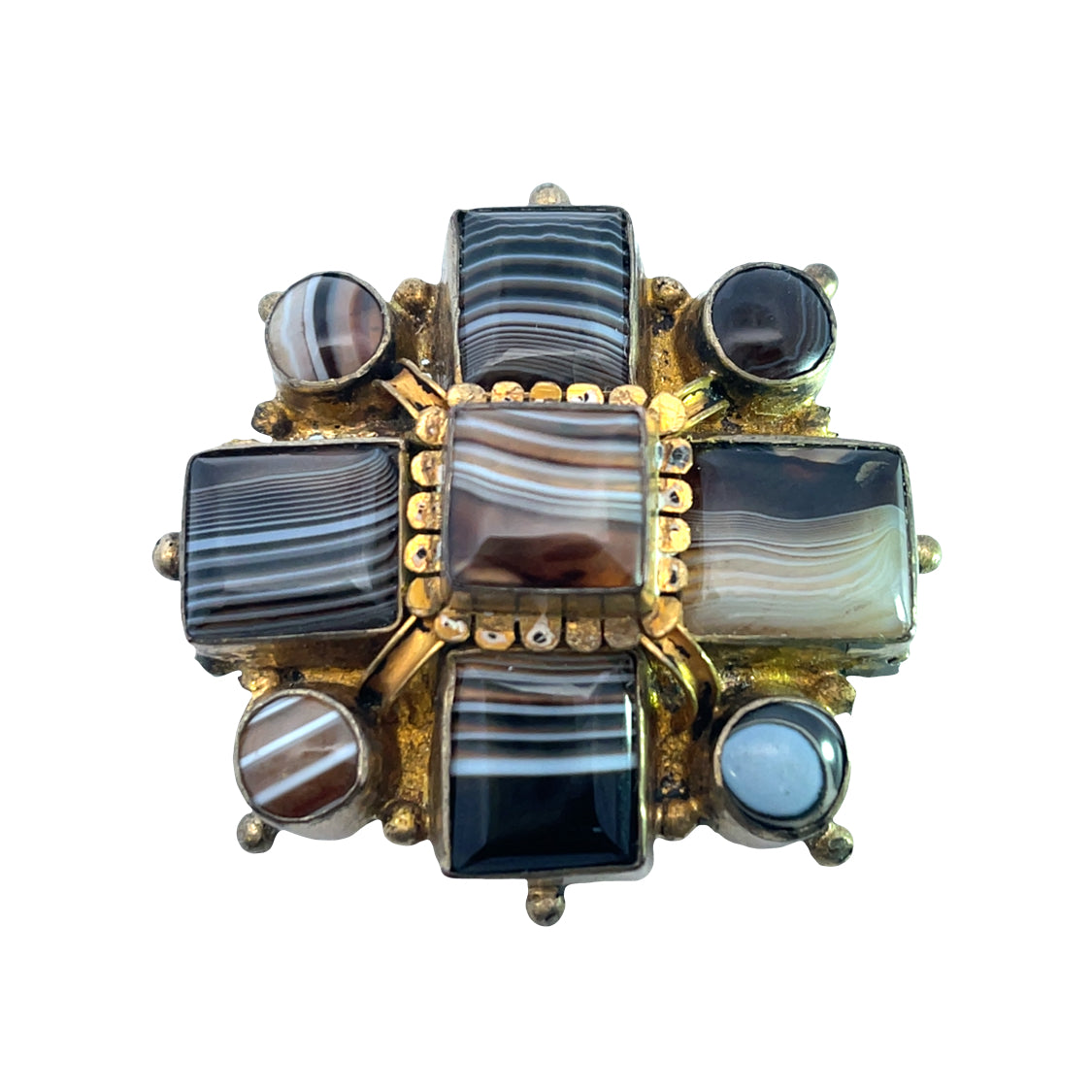 Description : What is amazing to learn is that the banded agates the Scots used in their jewelry, like this brooch from 1880, were mined or found in Scotland. There were several agate mines that provided the material for local lapidaries to cut and use for jewelry design. The metal is a gold wash over brass. These banded agates used are spectacular examples, and the plate that affixes the center stone and setting is hand engraved. The cross is a symbol of the Scottish Christian faith, that represented cultural unity and eternity. A very special historic piece of jewelry like this with such a great story, is always an eye catcher!