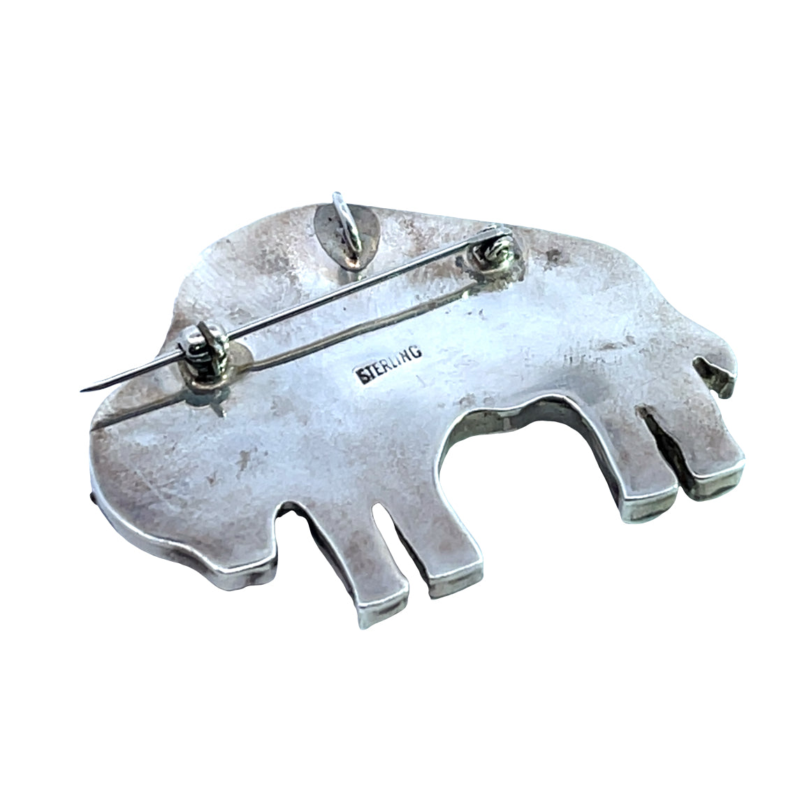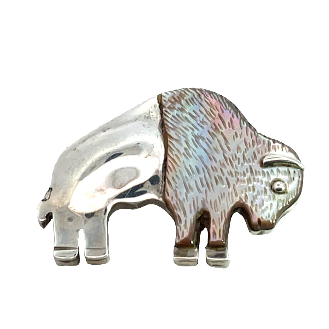 Description : Made from aragonite, the calciferous material known as mother of pearl is formed on the inside of a mollusk and designed to protect the organism. The milky white lining is luminous and iridescent. It is often a choice for Native American artisans, who use it in inlay and carving. A buffalo sterling silver pin is hand sawn into shape, and detailed with a coat of mother of pearl with textural detail affixed to the top of the silver. The result is the appearance of the buffalo's furry winter coat. His eye peeks out of the mother of pearl in sterling silver, a clever way to secure the mother of pearl to the silver. This is a convertible piece of jewelry that can be worn either as a pendant or a pin and stamped sterling.