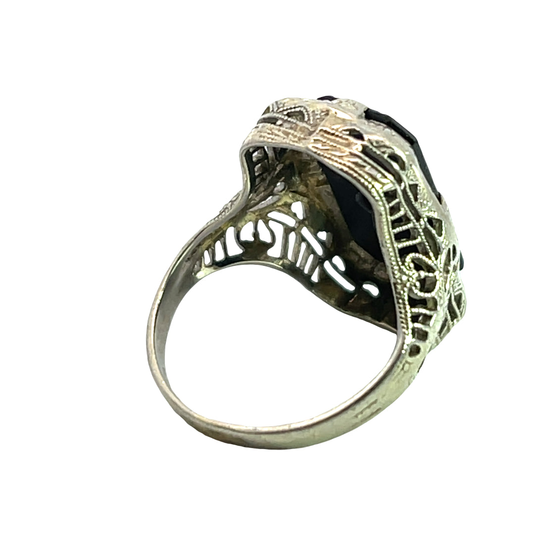 Material : 14K white gold frosted onyx diamondStyle : Art Deco filigree