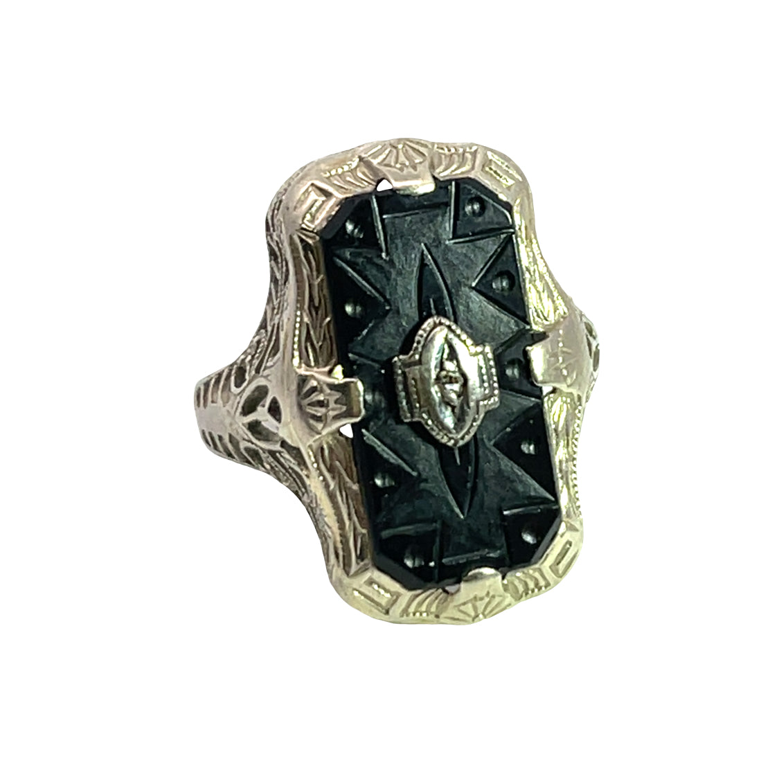 Description : Made by the famous Ostby and Barton company founded in 1879, and known for their rings, this signet style ring was produced c. 1920. A frosted rectangle of carved onyx is the host to a single diamond chip in the center. The 14K white gold filigree is in line with the Art Deco style. In very good condition,this ring is a size 3.5, most likely designed for a pinky finger.