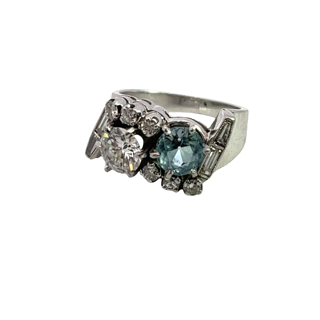 Description : A 'moi et toi' ring symbolizes the birthstones of two people. In this case it would be someone born in March, and the other in April. A single, 1 carat round, white, brilliant cut natural diamond is set with 6 prongs in platinum nestled next to a .81 carat round natural aquamarine, also set in 6 prongs. Three small diamonds arc over and under both gemstones, and are flanked by one straight, and one tapered natural diamond baguette with milgrain trim. The center gems are open in the back for maximum light transmission, enhancing the beauty of this size 6.5 ring. A slightly wider band helps to secure it on the hand, preventing this ring from turning on the finger. A custom ring of this type is extremely well built, and all the gems securely set. The side diamonds have approximately .65 total carat weight.