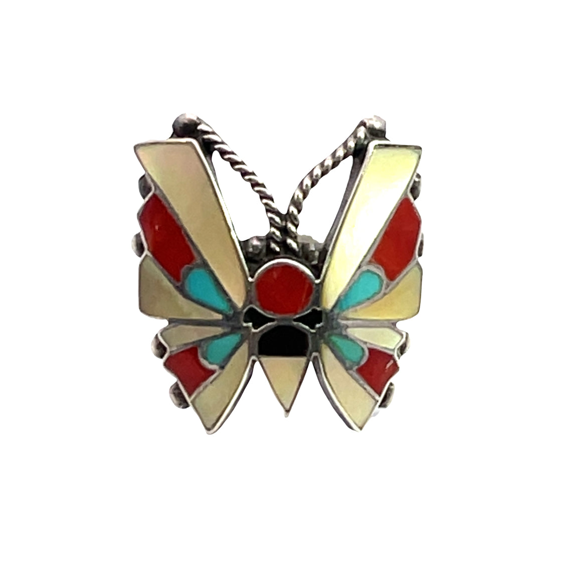 Native American Sterling Silver, mother of pearl, turquoise, onyx and coral butterfly ring